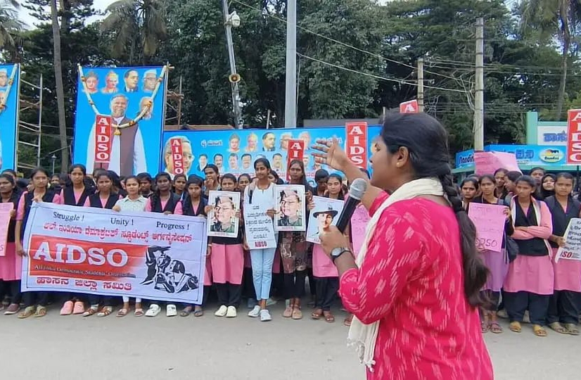 ಹಾಸನ.03.ಸೆಪ್ಟೆಂಬರ್.25:- ಸರ್ಕಾರಿ ಪ್ರಥಮ ದರ್ಜೆ ಕಾಲೇಜುಗಳಲ್ಲಿ ವಿದ್ಯಾರ್ಥಿಗಳ ಪಾಠ ಪ್ರವಚನ ಗೊಂದಲಗಳನ್ನು ಬಗೆಹರಿಸಲು ಆಗ್ರಹಿಸಿ ಎಐಡಿಎಸ್ಒ ನೇತೃತ್ವದಲ್ಲಿ ವಿವಿಧ ಕಾಲೇಜಿನ ನೂರಾರು ವಿದ್ಯಾರ್ಥಿಗಳ ನಗರದ ಹೇಮಾವತಿ ಪ್ರತಿಮೆ ಎದುರು ಮಂಗಳವಾರ ಪ್ರತಿಭಟನೆ ನಡೆಸಿದರು.