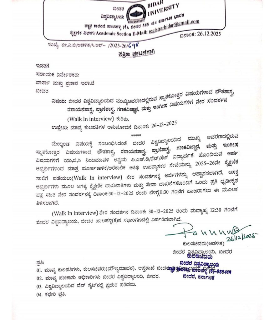 ಬೀದರ.25.ಡಿಸೆಂಬರ್.26:- ಬೀದರ ವಿಶ್ವವಿದ್ಯಾಲಯದ ಮುಖ್ಯ ಆವರಣದಲ್ಲಿರುವ ಸ್ನಾತಕೋತ್ತರ ವಿಷಯಗಳಾದ ಭೌತಶಾಸ್ತç, ರಸಾಯನಶಾಸ್ತç, ಪ್ರಾಣಿಶಾಸ್ತç, ಗಣಕವಿಜ್ಞಾನ, ಮತ್ತು ಇಂಗೀಷ ವಿಷಯಗಳಿಗೆ ಯು,ಜಿ,ಸಿ ನಿಯಮಾವಳಿ ಅನ್ವಯ ಪಿ.ಎಚ್.ಡಿ/ನೆಟ್/ಸೆಟ್ ವಿದ್ಯಾರ್ಹತೆ ಹೊಂದಿರುವ ಅರ್ಹ ಅಭ್ಯರ್ಥಿಗಳಿಂದ ಮಾತ್ರ ಪೂರ್ಣಕಾಳಿಕ/ಅರೆಕಾಲಿಕ ಅತಿಥಿ ಉಪನ್ಯಾಸಕರ ಸೇವೆಯನ್ನು 2025-26ನೇ ಶೈಕ್ಷಣಿಕ ಸಾಲಿಗೆ ಪಡೆಯಲು ನೇರ ಸಂದರ್ಶನಕ್ಕೆ ಅರ್ಜಿಗಳನ್ನು ಆಹ್ವಾನಿಸಲಾಗಿದೆ.