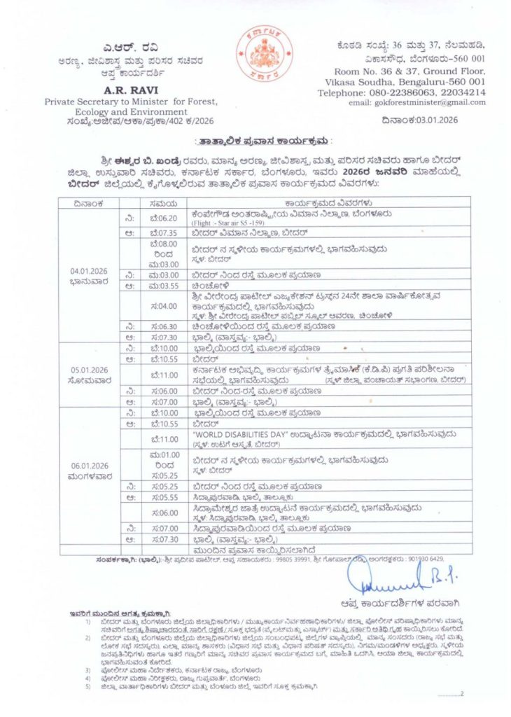 ಬೀದರ.03.ಜನವರಿ.26:- ಅರಣ್ಯ, ಜೀವಿಶಾಸ್ತ್ರ ಮತ್ತು ಪರಿಸರ ಹಾಗೂ ಬೀದರ ಜಿಲ್ಲಾ ಉಸ್ತುವಾರಿ ಸಚಿವರಾದ ಈಶ್ವರ ಬಿ.ಖಂಡ್ರೆ ಅವರು ಜನವರಿ.4 ರಿಂದ 6 ರವರೆಗೆ ಬೀದರ ಜಿಲ್ಲೆಯಲ್ಲಿ ಪ್ರವಾಸ ಕೈಗೊಂಡಿರುತ್ತಾರೆ.