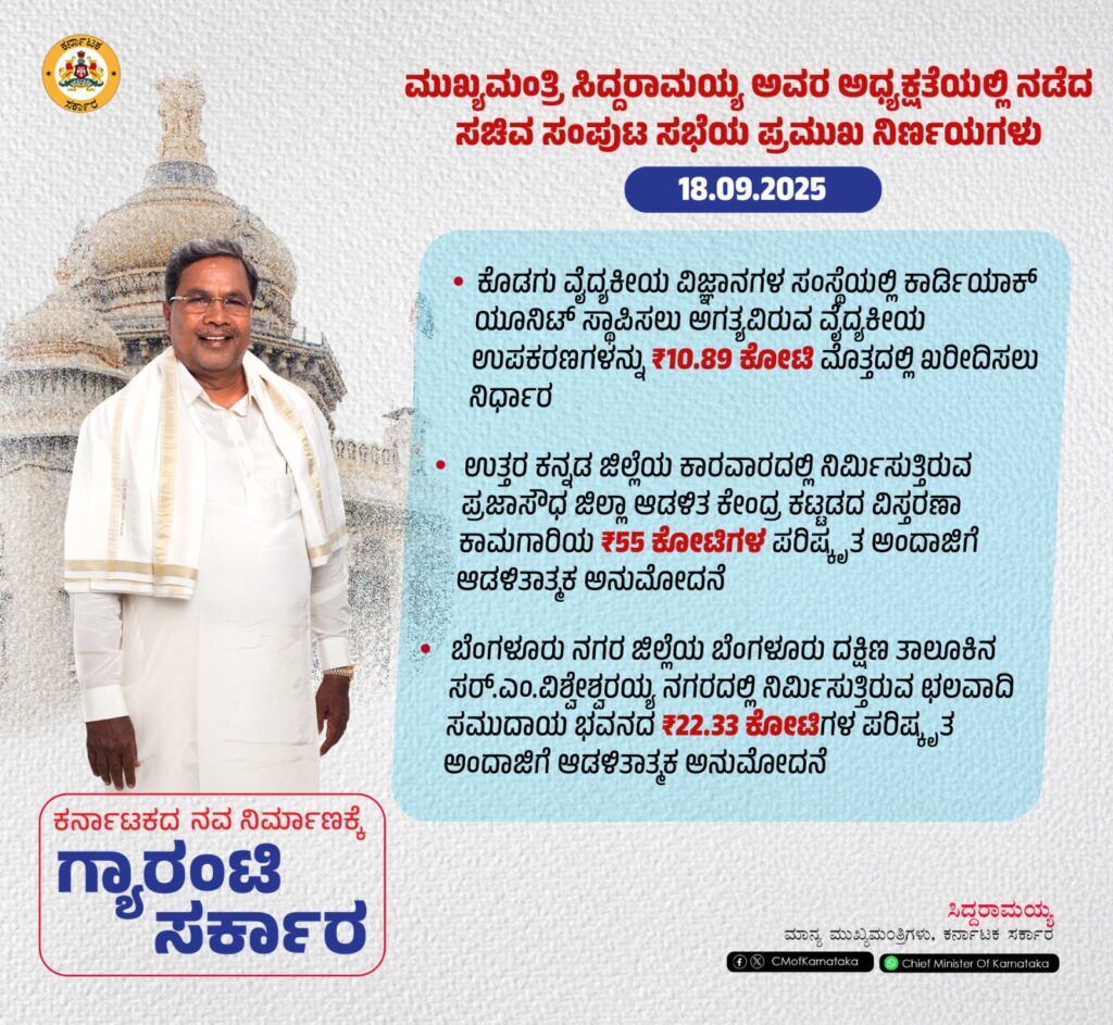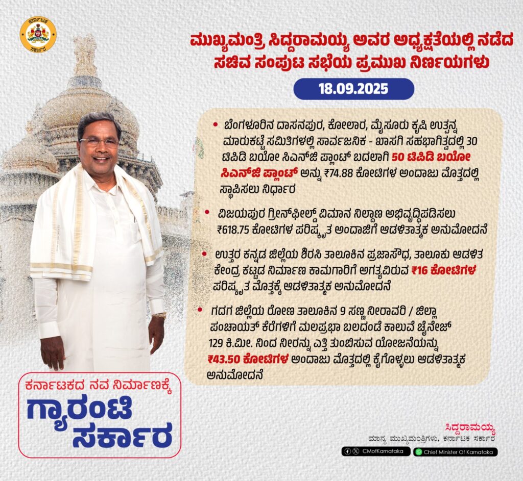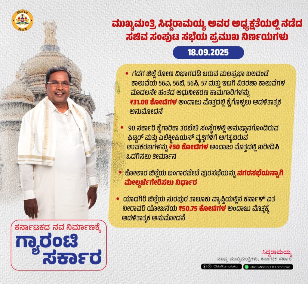 ಬೆಂಗಳೂರು: ಇಂದು ಮುಖ್ಯಮಂತ್ರಿ ಸಿದ್ದರಾಮಯ್ಯ ಅವರ ಅಧ್ಯಕ್ಷತೆಯಲ್ಲಿ ಇಂದು ಸಚಿವ ಸಂಪುಟ ಸಭೆ ನಡೆಯಿತು.ಸಭೆಯಲ್ಲಿ ವಿವಿಧ ಪ್ರಮುಖ ವಿಷಯಗಳಿಗೆ ಅನುಮೋದನೆ ನೀಡಲಾಗಿದೆ.
