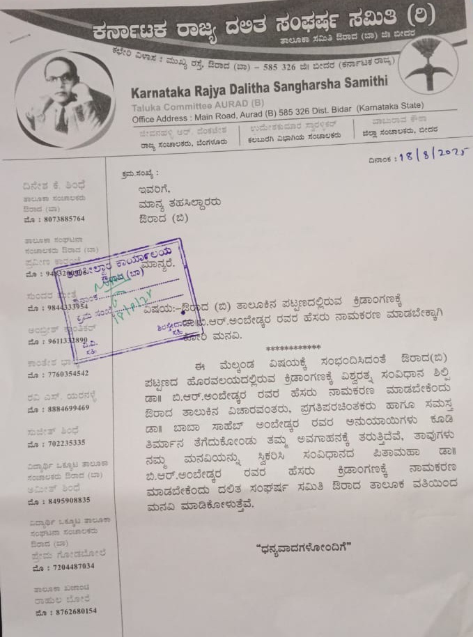 ಔರಾದ.18.ಆಗಸ್ಟ್ .25:- ಔರಾದ ತಾಲೂಕಿನ ಪಟ್ಟಣದಲ್ಲಿರುವ ಕ್ರೀಡಾಂಗಣಕ್ಕೆ ತಿಂಗೇರಾಡಾಬು.ಆರ್.ಅಂಬೇಡ್ಕರ ರವರ ಹೆಸರು ನಾಮಕರಣ ಮಾಡಬೇಕಾಗಿ ಮನವಿ ಸಲ್ಲಿಸಿದರೆ.