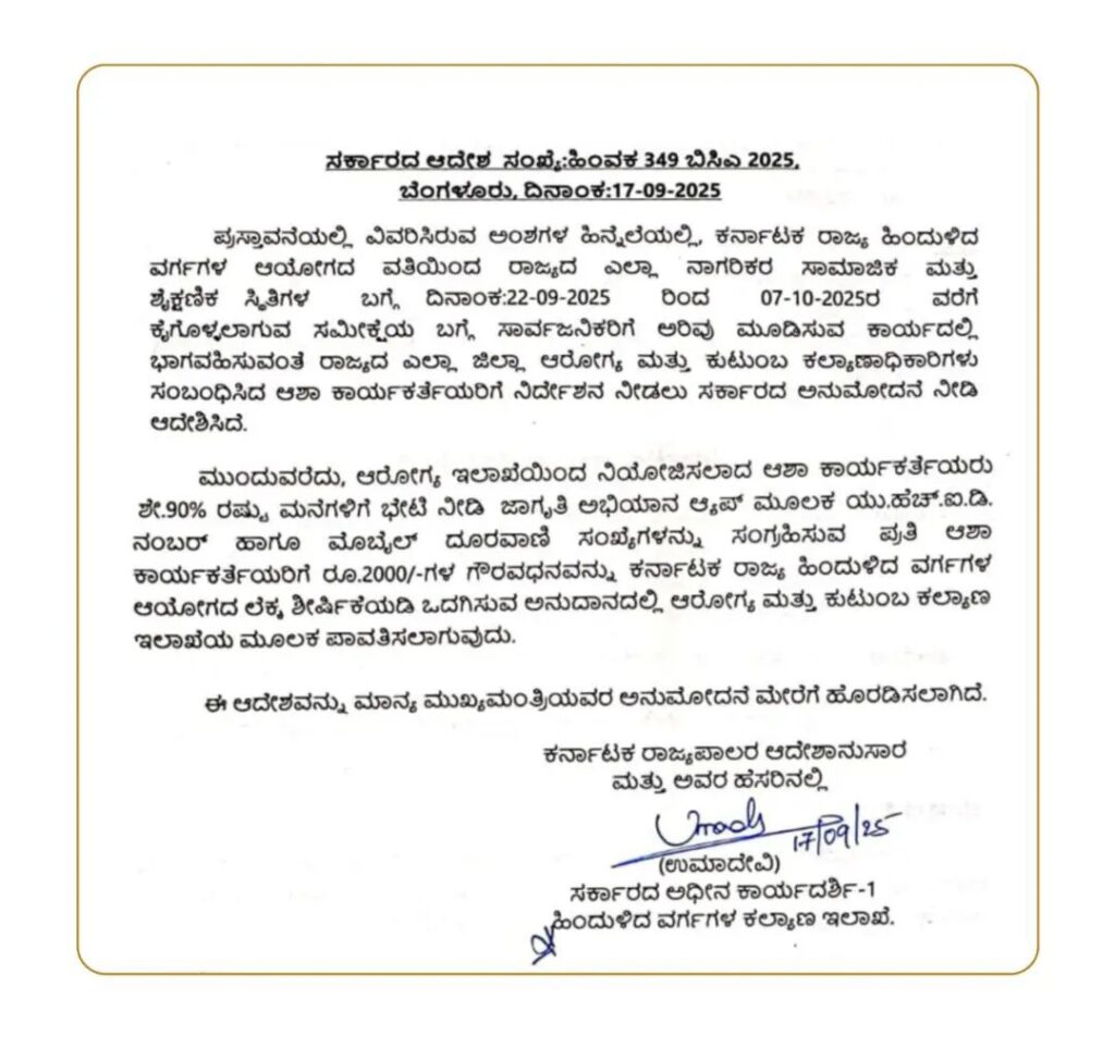 ಪ್ರಸ್ತಾವನೆಯಲ್ಲಿ ವಿವರಿಸಿರುವ ಅಂಶಗಳ ಹಿನ್ನೆಲೆಯಲ್ಲಿ, ಕರ್ನಾಟಕ ರಾಜ್ಯ ಹಿಂದುಳಿದ ವರ್ಗಗಳ ಆಯೋಗದ ವತಿಯಿಂದ ರಾಜ್ಯದ ಎಲ್ಲಾ ನಾಗರಿಕರ ಸಾಮಾಜಿಕ ಮತ್ತು ಶೈಕ್ಷಣಿಕ ಸ್ಥಿತಿಗಳ 2 20:22-09-2025 ರಿಂದ 07-10-20250 ವರೆಗೆ ಕೈಗೊಳ್ಳಲಾಗುವ ಸಮೀಕ್ಷೆಯ ಬಗ್ಗೆ ಸಾರ್ವಜನಿಕರಿಗೆ ಅರಿವು ಮೂಡಿಸುವ ಕಾರ್ಯದಲ್ಲಿ ಭಾಗವಹಿಸುವಂತೆ ರಾಜ್ಯದ ಎಲ್ಲಾ ಜಿಲ್ಲಾ ಆರೋಗ್ಯ ಮತ್ತು ಕುಟುಂಬ ಕಲ್ಯಾಣಾಧಿಕಾರಿಗಳು ಸಂಬಂಧಿಸಿದ ಆಶಾ ಕಾರ್ಯಕರ್ತೆಯರಿಗೆ ನಿರ್ದೇಶನ ನೀಡಲು ಸರ್ಕಾರದ ಅನುಮೋದನೆ ನೀಡಿ ಆದೇಶಿಸಿದೆ.