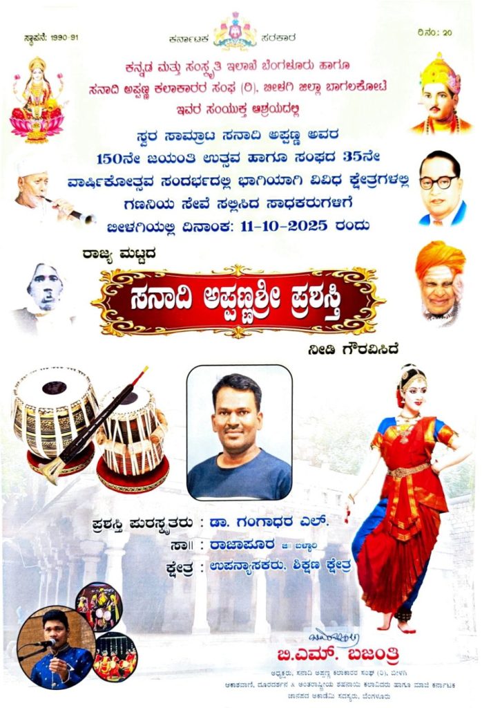 ಡಾ. ಗಂಗಾಧರ ಎಲ್ ಅವರಿಗೆ ಸನಾದಿ ಅಪ್ಪಣ್ಣಶ್ರೀ ಪ್ರಶಸ್ತಿ.!