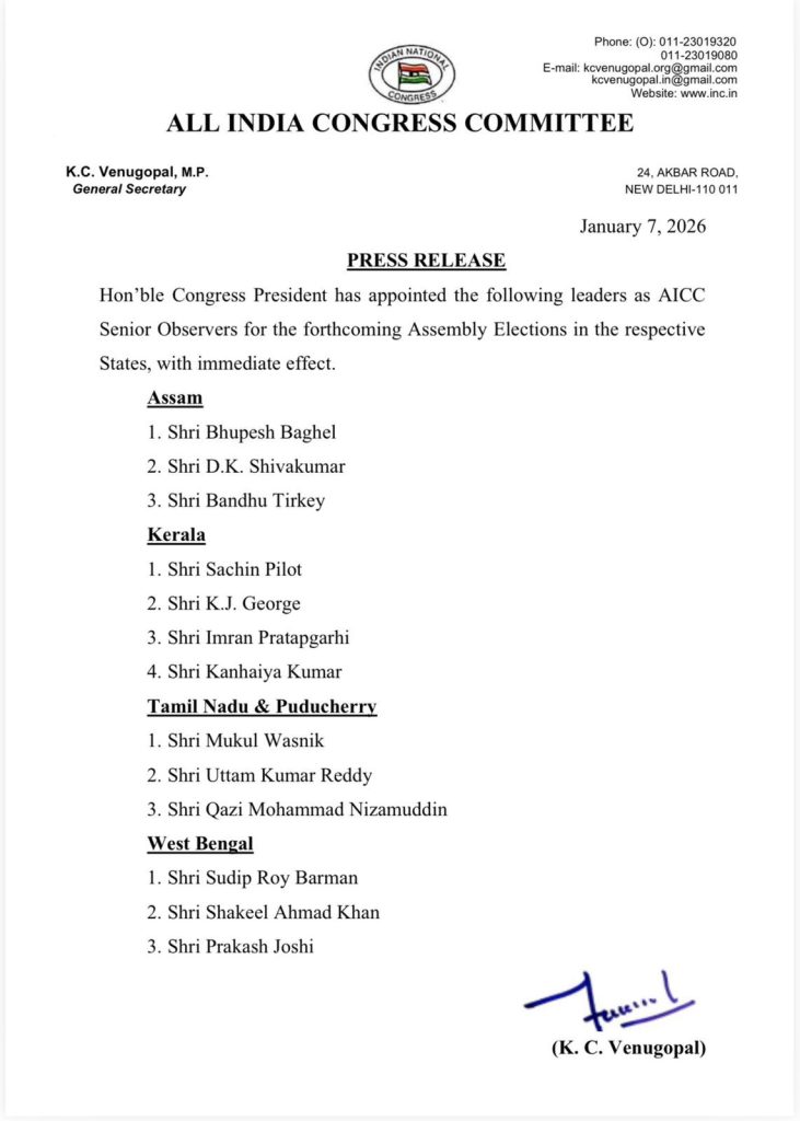 ಎಐಸಿಸಿ ಅಧ್ಯಕ್ಷ ಮಲ್ಲಿಕಾರ್ಜುನ ಖರ್ಗೆ ಅಸ್ಸಾಂ, ಕೇರಳ, ತಮಿಳುನಾಡು & ಪುದುಚೇರಿ, ಪಶ್ಚಿಮ ಬಂಗಾಳ ರಾಜ್ಯಗಳಿಗೆ ಎಐಸಿಸಿ ಹಿರಿಯ ಉಸ್ತುವಾರಿಗಳನ್ನು ನೇಮಕ ಮಾಡಿದ್ದಾರೆ. ಕರ್ನಾಟಕದ ಇಬ್ಬರ ನಾಯಕರಿಗೆ ಮಾತ್ರ ಜವಾಬ್ದಾರಿ ವಹಿಸಲಾಗಿದೆ.