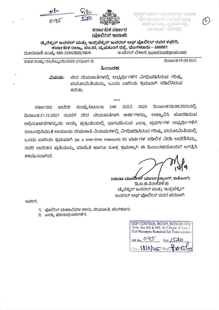 ಈ ಕುರಿತಂತೆ ರಾಜ್ಯ ಸರ್ಕಾರದಿಂದ ಆದೇಶ ಹೊರಡಿಸಲಾಗಿದ್ದು, ದಿನಾಂಕ:06.09.2025ರಲ್ಲಿ ಸರ್ಕಾರದ ಆದೇಶ ದಿನಾಂಕ:31,12.2027 ರವರೆಗೆ ನೇರ ನೇಮಕಾತಿಗಾಗಿ ಅರ್ಜಿಗಳನ್ನು ಆಹ್ವಾನಿಸಿ ಹೊರಡಿಸುವ ಅಧಿಸೂಚನೆಗಳನ್ವಯ ಆಯ್ಕೆ ಪ್ರಕ್ರಿಯೆಯಲ್ಲಿ ಭಾಗವಹಿಸುವ ಎಲ್ಲಾ ಪವರ್ಗಗಳ ಅಭ್ಯರ್ಥಿಗಳಿಗೆ ಸಂಬಂಧಿಸಿದಂತೆ ಆಯಾಯ ನೇಮಕಾತಿ ನಿಯಮಗಳಲ್ಲಿ ನಿಗಧಿಪಡಿಸಿರುವ ಗರಿಷ್ಟ ವಯೋಮಿತಿಯಲ್ಲಿ ಒಂದು ಬಾರಿಯ ಕ್ರಮವಾಗಿ (as a one-time measure) 02 ವರ್ಷಗಳ ಸಡಿಲಿಕೆ ನೀಡಿ ಆದೇಶಿಸಿದ ಎಂದು ತಿಳಿಸಿದೆ.