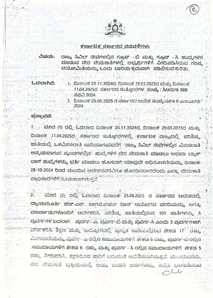 ದಿನಾಂಕ 25.08.2025 ರ ಸರ್ಕಾರದ ಆದೇಶದಲ್ಲಿ ನ್ಯಾಯಮೂರ್ತಿ ಹೆಚ್.ಎನ್. ನಾಗಮೋಹನ್ ದಾಸ್ ಆಯೋಗದ ವರದಿಯನ್ನು ಅಗತ್ಯ ಮಾರ್ಪಾಡುಗಳೊಂದಿಗೆ ಅಂಗೀಕರಿಸಿ, ಪರಿಶಿಷ್ಟ ಜಾತಿಯಲ್ಲಿರುವ 101 ಜಾತಿಗಳನ್ನು 5 ಪುವರ್ಗಗಳ ಬದಲಾಗಿ ಪವರ್ಗ-ಎ, ಪವರ್ಗ-ಬಿ ಮತ್ತು ಪುವರ್ಗ-ಸಿ ಎಂದು 3 ಪವರ್ಗಗಳಾಗಿ ವರ್ಗೀಕರಿಸಿ, ಶಿಕ್ಷಣ ಮತ್ತು ಉದ್ಯೋಗದಲ್ಲಿ ಪ್ರಸ್ತುತ ಜಾರಿಯಲ್ಲಿರುವ ಶೇಕಡ 17 ಮೀಸಲಾತಿಯನ್ನು ಪ್ರವರ್ಗ- ಎ ರಲ್ಲಿನ ಸಮುದಾಯಗಳಿಗೆ ಶೇಕಡ 6 ರಷ್ಟು, ಪವರ್ಗ-ಬ ರಲ್ಲಿನ ಸಮುದಾಯಗಳಿಗೆ ಶೇಕಡ 6 ರಷ್ಟು ಮತ್ತು ಪ್ರವರ್ಗ – ಸಿ ರಲ್ಲಿನ ಸಮುದಾಯಗಳಿಗೆ ಶೇಕಡ 5 ರಮ ನಿಗದಿಸಿ, ತಕ್ಷಣದಿಂದ ಜಾರಿಗೆ ಬರುವಂತೆ ಆದೇಶಿಸಲಾಗಿರುತ್ತದೆ. ಮುಂದುವರೆದು, ನೇರ ನೇಮಕಾತಿ ಪ್ರಕ್ರಿಯೆಯಲ್ಲಿ ಆಯ್ಕೆ ಬಯಸಿ ಅರ್ಜಿಗಳನ್ನು ಸಲ್ಲಿಸಿ ಭಾಗವಹಿಸುವ ಅಭ್ಯರ್ಥಿಗಳಿಗೆ ಸಂಬಂಧಿಸಿದಂತೆ ಆಯಾಯ ನೇಮಕಾತಿ ನಿಯಮಗಳಲ್ಲಿ ನಿಗದಿಪಡಿಸಿರುವ ಗರಿಷ್ಠ ವಯೋಮಿತಿಯಲ್ಲಿ ಒಂದು ಬಾರಿಯ ಕ್ರಮವಾಗಿ 2 ವರ್ಷಗಳ ಸಡಿಲಿಕೆ ನೀಡಲು ತೀರ್ಮಾನಿಸಲಾಗಿರುತ್ತದೆ.