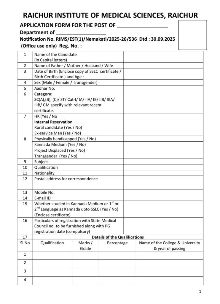 (RIMS) ಸಹಾಯಕ ಪ್ರಾಧ್ಯಾಪಕರ (ಅರವಳಿಕೆ) ಹುದ್ದೆಗಳಿಗೆ – ಅರಿವಳಿಕೆಶಾಸ್ತ್ರದಲ್ಲಿ ಎಂಡಿ/ಡಿಎಂ ಪೂರ್ಣಗೊಳಿಸಿರಬೇಕು ಹಾಗೂ ಕಾರ್ಡಿಯಾಕ್ ಸರ್ಜರಿಯಲ್ಲಿ ಒಂದು ವರ್ಷದ ಅನುಭವ ಹೊಂದಿರಬೇಕು.