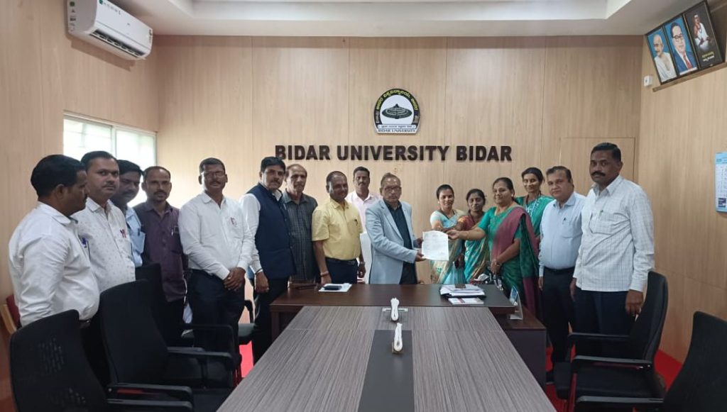 ಬೀದರ.16.ಆಕ್ಟೋಬರ.25:- ಬೀದರ್ ವಿಶ್ವವಿದ್ಯಾಲಯ ಬೀದರ್ ಅಡಿಯಲ್ಲಿ ಬರುವ ಎಲ್ಲಾ ಪದವಿ ಕಾಲೇಜುಗಳಲ್ಲಿ B.A 1st & 3rd Sem SEP ಕಾರ್ಯಭಾರ ಸಮಾಜಶಾಸ್ತ್ರ ಹಾಗೂ ಇತರ ಸಮಾಜ ವಿಜ್ಞಾನ ವಿಭಾಗಗಳ ಪ್ರಸ್ತುತ ಸಾಲಿನಿಂದ 5 ಗಂಟೆ ಇದ್ದ ಕಾರ್ಯಭಾರವನ್ನು 6 ಗಂಟೆ ಗೆ ಹೆಚ್ಚಿಸಲು ಮಾನ್ಯ ಕುಲಪತಿಗಳು & ಮಾನ್ಯ ಕುಲಸಚಿವರು ಬೀದರ್ ವಿಶ್ವವಿದ್ಯಾಲಯ ಬೀದರ್ ಇವರಿಗೆ, ಇಂದು ಬೀದರ್ ವಿಶ್ವವಿದ್ಯಾಲಯ ಸಮಾಜಶಾಸ್ತ್ರ ಪ್ರಾಧ್ಯಾಪಕರ ಸಂಘದ ವತಿಯಿಂದ ಮನವಿ ಸಲ್ಲಿಸಲಾಯಿತು. ಸಂಘದ ಗೌರವಾಧ್ಯಕ್ಷರು ಅಧ್ಯಕ್ಷರು ಎಲ್ಲಾ ಪದಾಧಿಕಾರಿಗಳು ಭಾಗವಹಿಸಿದ್ದರು.
