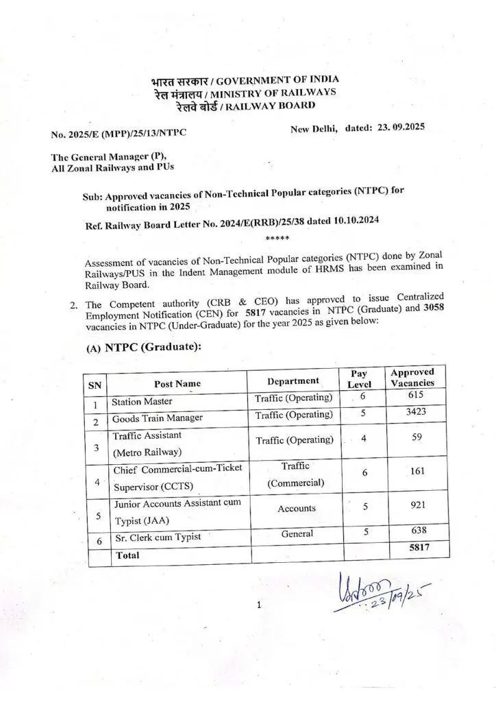 ಭಾರತೀಯ ರೈಲ್ವೇ ಇಲಾಖೆಯಲ್ಲಿ (ತಾಂತ್ರಿಕೇತರ ಜನಪ್ರಿಯ ವರ್ಗಗಳ (NTPC) ಅಧಿಸೂಚನೆಯನ್ನು ಬಿಡುಗಡೆ ಮಾಡಿದೆ, ಇದು ಯಾವದೇ ಪದವಿ ಮತ್ತು ಪಿಯುಸಿ ಅಭ್ಯರ್ಥಿಗಳಿಗೆ ಒಟ್ಟು 8,875 ಹುದ್ದೆಗಳನ್ನು ಭರ್ತಿ ಮಾಡಲು ರೈಲ್ವೇ ಇಲಾಖೆ ಅಧಿಸೂಚನೆ ಹೊರಡಿಸಿದೆ.