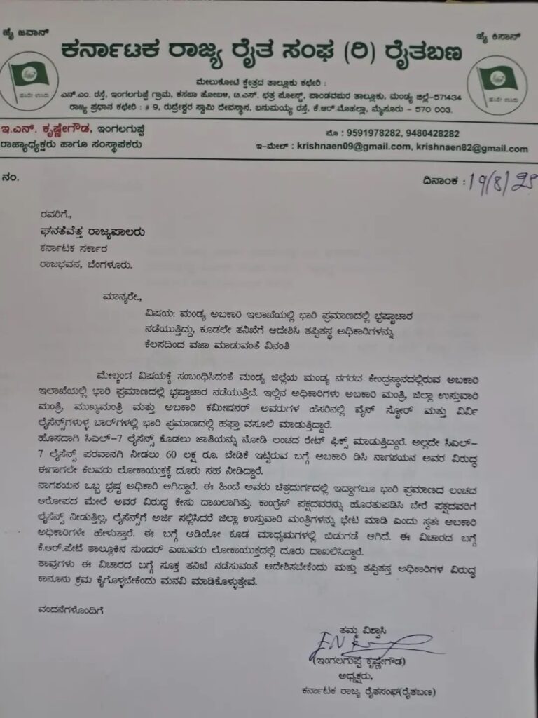 ಬೆಂಗಳೂರು.13.ಸೆಪ್ಟೆಂಬರ್.25:-ಸರ್ಕಾರಕ್ಕೆ ಸೂಚಿಸುವಂತೆ ಕೋರಿ ರಾಜ್ಯಪಾಲ ಥಾವರ್ಚಂದ್ ಗೆಹಲೋತ್ ಅವರಿಗೆ, ಲೋಕಾಯುಕ್ತಕ್ಕೆ ಕರ್ನಾಟಕ ರಾಜ್ಯ ರೈತ ಸಂಘ ದೂರು ಕೊಟ್ಟಿದೆ. ಮಂಡ್ಯದ ಅಬಕಾರಿ ಕಚೇರಿಯಲ್ಲಿ ಭಾರಿ ಭ್ರಷ್ಟಾಚಾರ ನಡೆಯುತ್ತಿರುವ ಬಗ್ಗೆ ತನಿಖೆ ನಡೆಸಿ ತಪ್ಪಿತಸ್ಥ ಅಧಿಕಾರಿಗಳ ವಿರುದ್ಧ ಕ್ರಮಕೈಗೊಳ್ಳಲು ರೈತ ಸಂಘ ದೂರು ಕೊಟ್ಟಿದೆ.