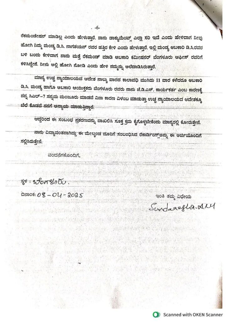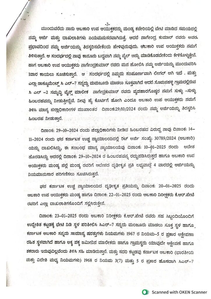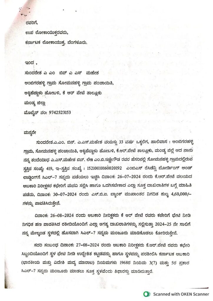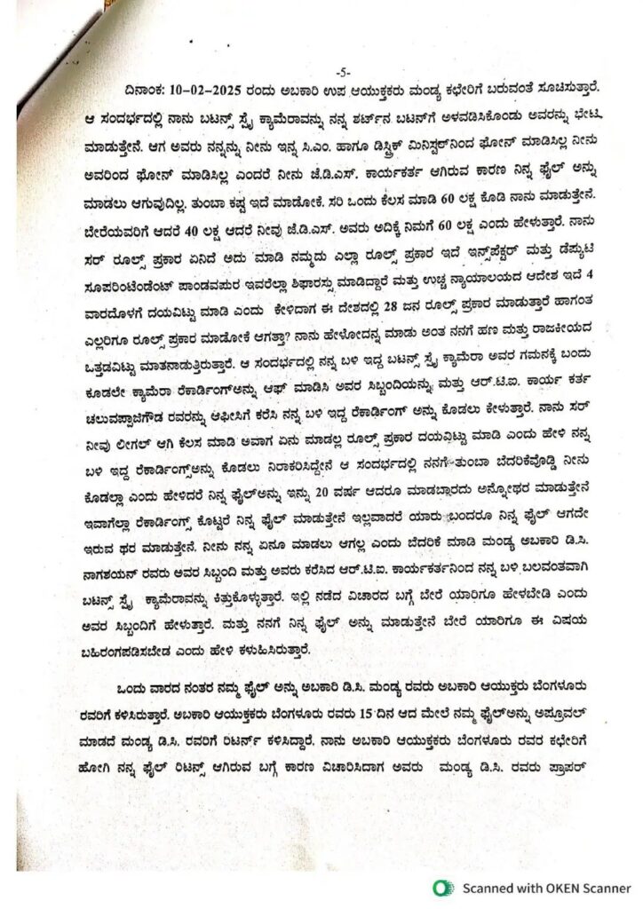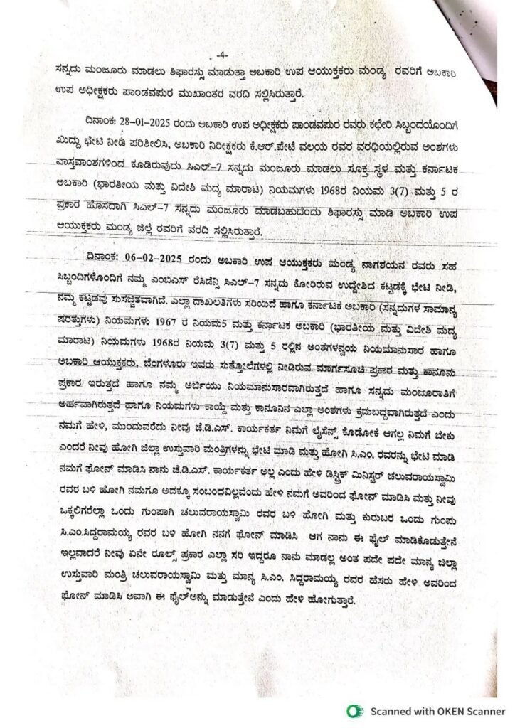 ಸಿಎಲ್7 ಪರವಾನಗಿ ಮಂಜೂರಾತಿಗೆ 60 ಲಕ್ಷ ರೂ.ಲಂಚಕ್ಕೆ ಬೇಡಿಕೆ ಇಟ್ಟಿರುವ ಮಂಡ್ಯ ಅಬಕಾರಿ ಉಪ ಆಯುಕ್ತ ನಾಗಶಯನ ವಿರುದ್ಧ ಲೋಕಾಯುಕ್ತಕ್ಕೆ ಅರ್ಜಿದಾರ ಎ.ಎಂ. ಸುಂದರೇಶ ದೂರು ಕೊಟ್ಟಿದ್ದಾರೆ. ಜೊತೆಗೆ, ಲಂಚದ ಬಗ್ಗೆ ನಾಗಶಯನ ಮಾತನಾಡಿರುವ ರೆಕಾರ್ಡ್ಡಿಂಗ್ಸ್ ಅನ್ನು ಸಾಕ್ಷಿಯಾಗಿ ಲೋಕಾಯುಕ್ತಕ್ಕೆ ಅಧಿಕಾರಿಗಳಿಗೆ ಸುಂದರೇಶ ನೀಡಿದ್ದಾರೆ. ಅರ್ಜಿ ಸರಿ ಇದ್ದರೂ ಜೆಡಿಎಸ್ ಕಾರ್ಯಕರ್ತ ಆಗಿರುವ ಕಾರಣ ಜಿಲ್ಲಾ ಉಸ್ತುವಾರಿ ಮಂತ್ರಿ, ಸಿಎಂ ಅವರನ್ನು ಭೇಟಿ ಮಾಡಬೇಕೆಂದು ಅಧಿಕಾರಿ ಹೇಳುತ್ತಾರೆ. ಹಾಗಾಗಿ, ಈ ಸಂಬಂಧ ಪ್ರಕರಣ ದಾಖಲಿಸಿ ಸೂಕ್ತ ಕ್ರಮಕೈಗೊಳ್ಳುವಂತೆ ದೂರಿನಲ್ಲಿ ಸುಂದರೇಶ ಮನವಿ ಮಾಡಿದ್ದಾರೆ.