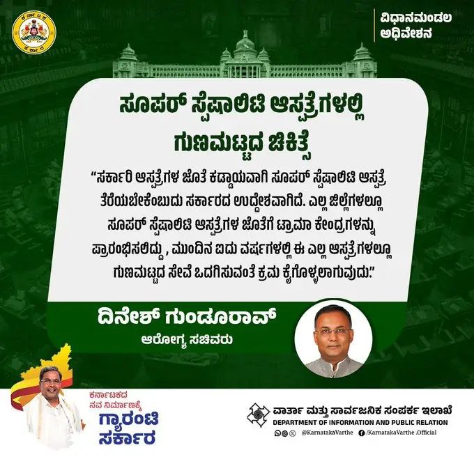 ಬೆಂಗಳೂರು.19.ಆಗಸ್ಟ್.25:- ರಾಜ್ಯಾದ್ಯಂತ ಸರ್ಕಾರಿ ಆಸ್ಪತ್ರೆಗಳ ಜೊತೆ ಕಡ್ಡಾಯವಾಗಿ ಸೂಪರ್‌ ಸ್ಪೆಷಾಲಿಟಿ ಆಸ್ಪತ್ರೆ ತೆರೆಯಬೇಕೆಂಬುದು ಸರ್ಕಾರದ ಉದ್ದೇಶವಾಗಿದೆ ಎಂದು ಆರೋಗ್ಯ ಸಚಿವ ದಿನೇಶ್‌ ಗುಂಡೂರಾವ್‌ ಅವರು ವಿಧಾನ ಮಂಡಲದ ಅಧಿವೇಶನದಲ್ಲಿ ಪ್ರಶ್ನೋತ್ತರ ಕಲಾಪದ ವೇಳೆ ತಿಳಿಸಿದರು.