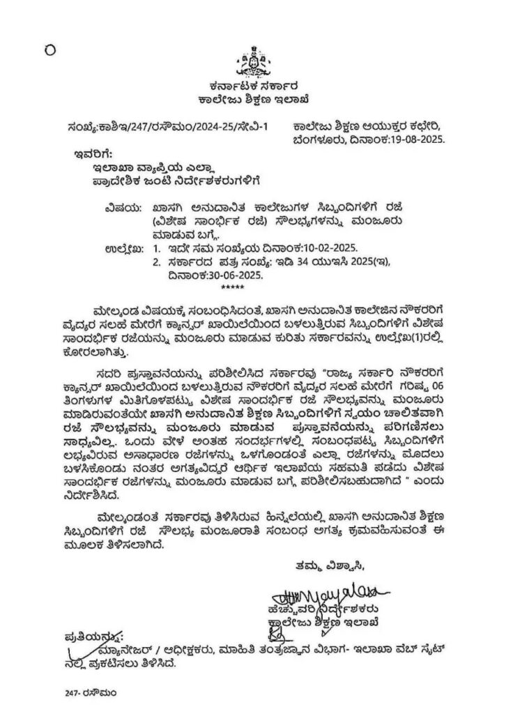 ಬೆಂಗಳೂರು.24.ಆಗಸ್ಟ್.25:- ಕಾಲೇಜು ಶಿಕ್ಷಣ ಇಲಾಖೆಯ ಖಾಸಗಿ ಅನುದಾನಿತ ಕಾಲೇಜುಗಳ ಸಿಬ್ಬಂದಿಗಳಿಗೆ ರಜೆ (ವಿಶೇಷ ಸಾಂರ್ಭಿಕ ರಜೆ) ಸೌಲಭ್ಯಗಳನ್ನು ಮಂಜೂರು ಮಾಡುವ ಬಗ್ಗೆ ರಾಜ್ಯ ಸರ್ಕಾರವು ಮಹತ್ವದ ಆದೇಶ ಹೊರಡಿಸಿದೆ.