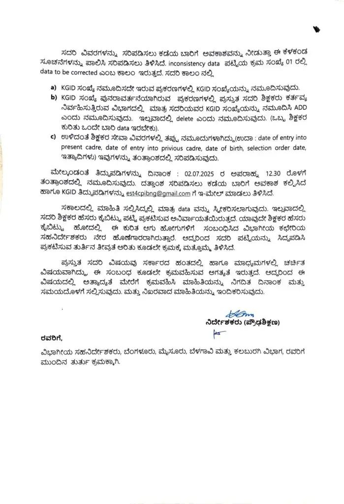 ಮೇಲ್ಕಂಡಂತೆ ತಿದ್ದುಪಡಿಗಳನ್ನು ದಿನಾಂಕ : 02.07.2025 ರ ಅಪರಾಹ್ನ 12.30 ರೊಳಗೆ ತಂತ್ರಾಂಶದಲ್ಲಿ ನಮೂದಿಸುವುದು. ದತ್ತಾಂಶ ಸರಿಪಡಿಸಲು ಕಡೆಯ ಬಾರಿಗೆ ಅವಕಾಶ ಕಲ್ಪಿಸಿದೆ ಹಾಗೂ KGID ತಿದ್ದುಪಡಿಗಳನ್ನು est4cpibng@gmail.com ಗೆ ಇ-ಮೇಲ್ ಮಾಡಲು ತಿಳಿಸಿದೆ.