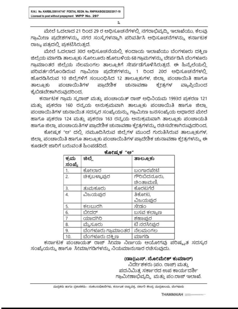 ಮೇಲೆ ಓದಲಾದ 30ರ ಅಧಿಸೂಚನೆಯಲ್ಲಿ ಕಂದಾಯ ಇಲಾಖೆಯು ಬೆಂಗಳೂರು ದಕ್ಷಿಣ ಜಿಲ್ಲೆಯ ಮಾಗಡಿ ತಾಲ್ಲೂಕು ಸೋಲೂರು ಹೋಬಳಿಯ 68 ಗ್ರಾಮಗಳನ್ನು ಬೇರ್ಪಡಿಸಿ ಬೆಂಗಳೂರು ಗ್ರಾಮಾಂತರ ಜಿಲ್ಲೆಯ ನೆಲಮಂಗಲ ತಾಲ್ಲೂಕಿಗೆ ಸೇರ್ಪಡೆಗೊಳಿಸಿರುತ್ತದೆ. ಈ ಹಿನ್ನೆಲೆಯಲ್ಲಿ ಪರಿವರ್ತನೆಗೊಂಡಿರುವ ಗ್ರಾಮೀಣ ಪ್ರದೇಶಗಳನ್ನು 1 ರಿಂದ 20ರ ಅಧಿಸೂಚನೆಗಳಲ್ಲಿ ಹೊರಡಿಸಿರುವ 10 ಜಿಲ್ಲೆಗಳಿಗೆ ಸಂಬಂಧಿಸಿದ 12 ತಾಲ್ಲೂಕುಗಳ, ಜಿಲ್ಲಾ ಪಂಚಾಯಿತಿ ಹಾಗೂ ತಾಲ್ಲೂಕು ಪಂಚಾಯಿತಿಗಳ ಪ್ರಾದೇಶಿಕ ಚುನಾವಣಾ ಕ್ಷೇತ್ರಗಳ ವ್ಯಾಪ್ತಿಯಿಂದ ಕೈಬಿಡಬೇಕಾಗಿರುವುದರಿಂದ,