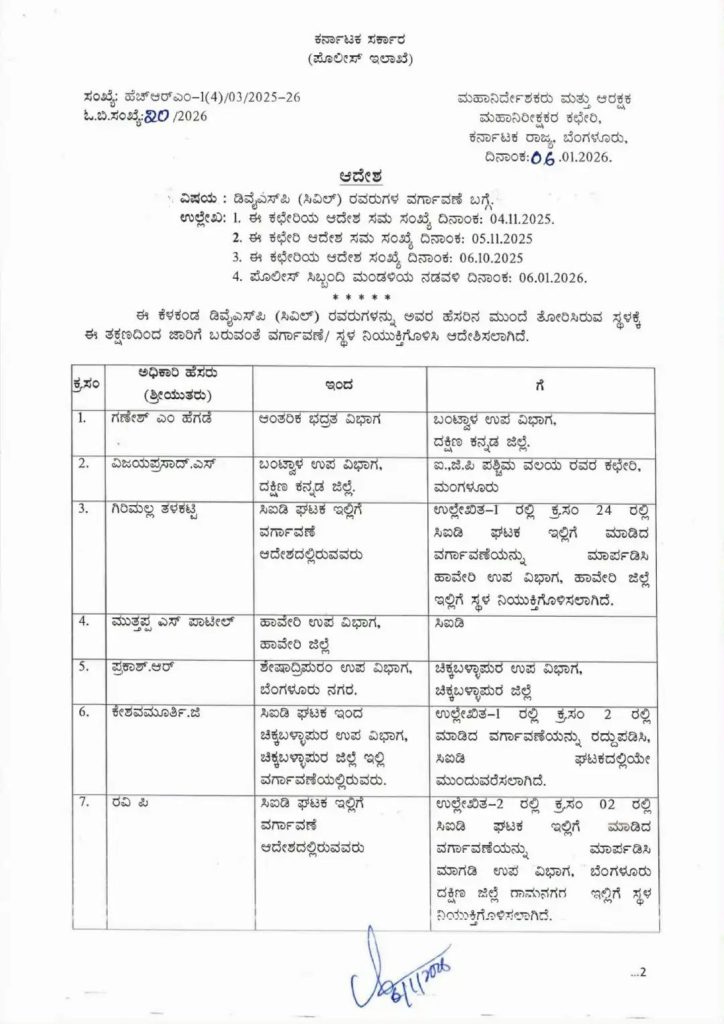 ಬೆಂಗಳೂರು.07.ಜನವರಿ.26: ರಾಜ್ಯ ಸರ್ಕಾರದಿಂದ ಆಡಳಿತ ಯಂತ್ರಕ್ಕೆ ಮೇಜರ್ ಸರ್ಜರಿ ಎನ್ನುವಂತೆ 19 ಡಿವೈಎಸ್ಪಿ ಸಿವಿಲ್ ಅವರನ್ನು ವರ್ಗಾವಣೆ ಮಾಡಿ ಆದೇಶ ಹೊರಡಿಸಲಾಗಿದೆ..