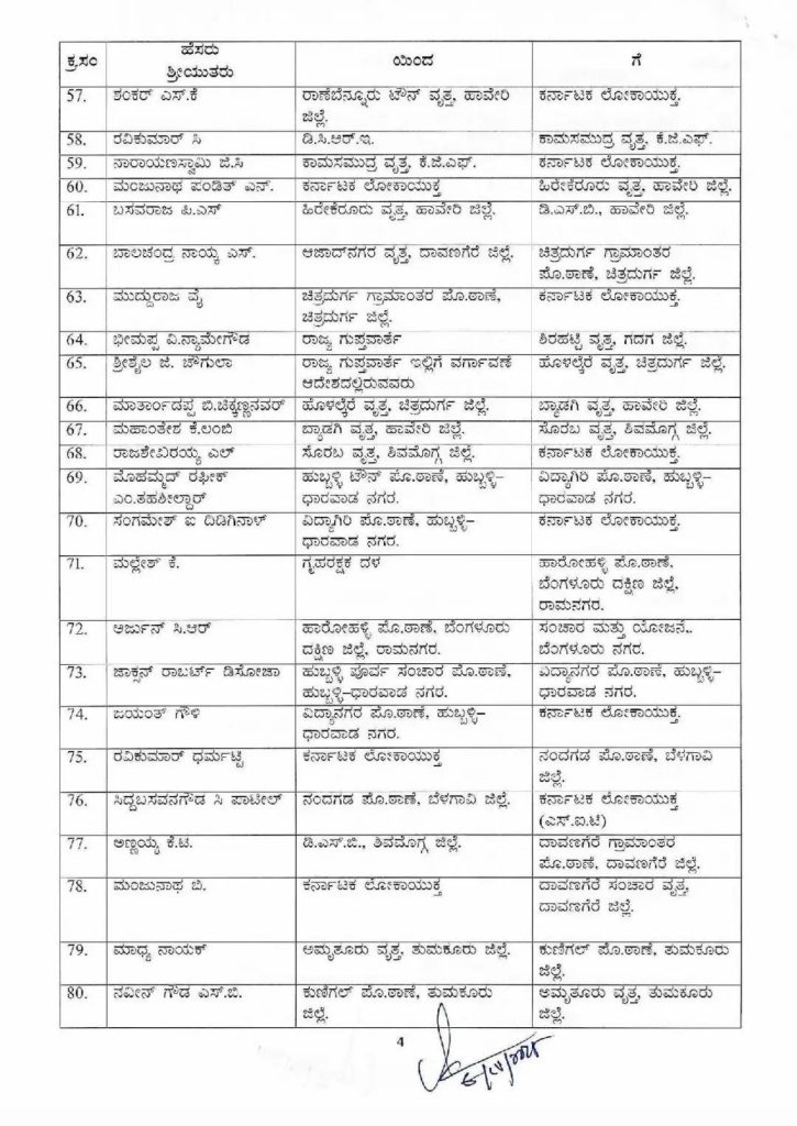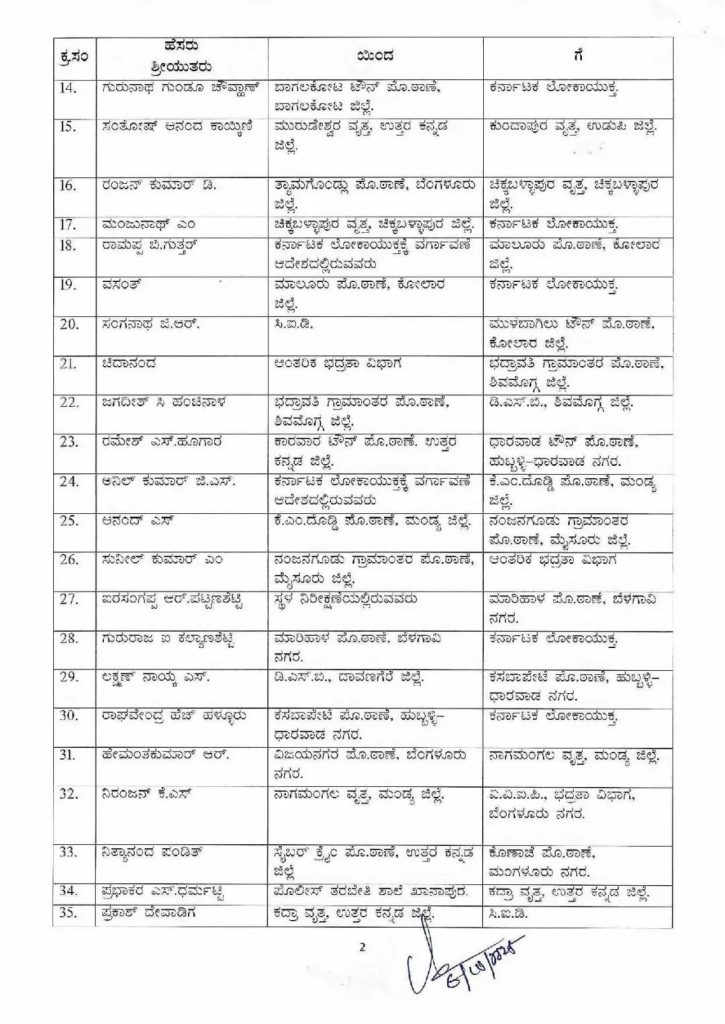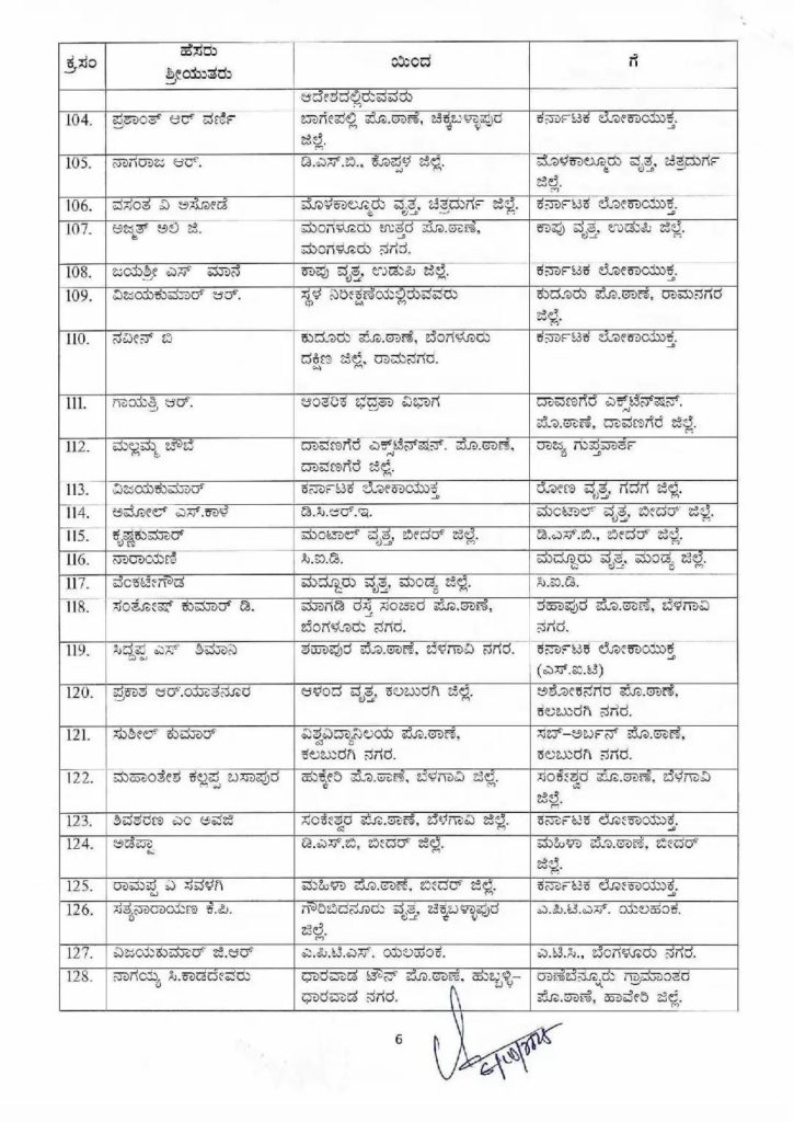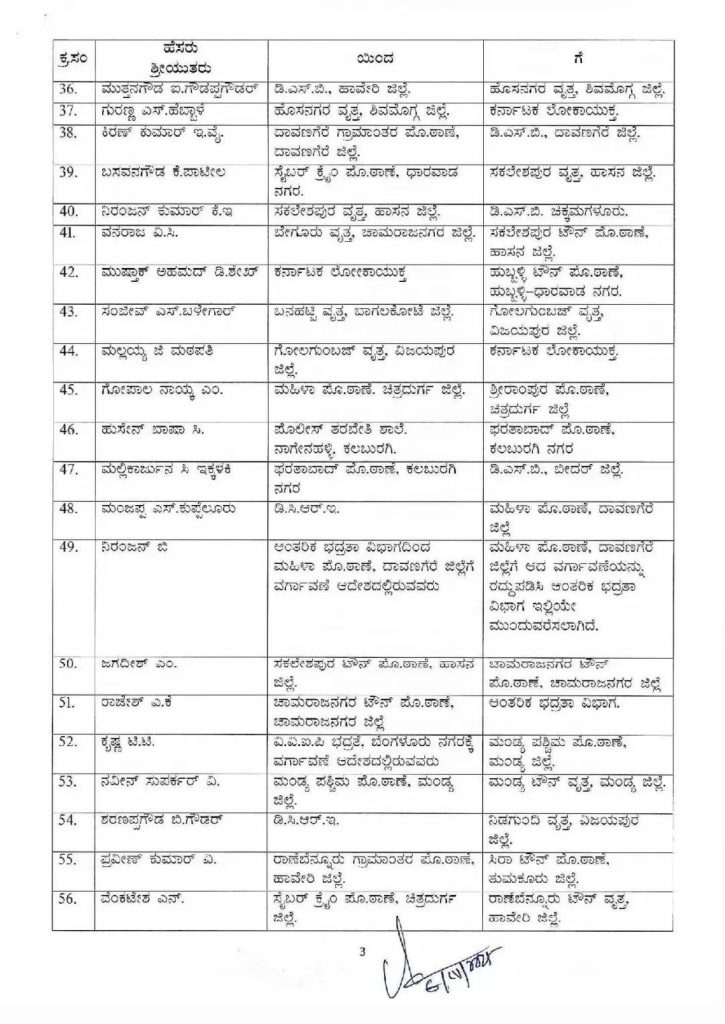 ಸವದತ್ತಿ ಪೊಲೀಸ್ ಠಾಣೆಯ ಧರ್ಮಾಕರ್ ಎಸ್ ಧರ್ಮಟ್ಟಿ ಅವರನ್ನು ಬೆಳಗಾವಿಯ ಕಂಗ್ರಾಳಿ ಕೆ ಎಸ್ ಆರ್ ಪಿ ಪೊಲೀಸ್ ತರಬೇತಿ ಶಾಲೆಗೆ, ಶಿವಮೊಗ್ಗದ ಡಿಎಸ್ ಬಿ ಅಣ್ಣಯ್ಯ ಕೆ.ಟಿ ಅವರನ್ನು ದಾವಣಗೆರೆ ಗ್ರಾಮಾಂತರ ಪೊಲೀಸ್ ಠಾಣೆಗೆ, ಚಿತ್ರದುರ್ಗದ ಹೊಳಲ್ಕೆರೆ ವೃತ್ತದ ಮಾರ್ತಾಂಡಪ್ಪ ಬಿ ಚಿಕ್ಕಣ್ಣನವರ್ ಅನ್ನು ಹಾವೇರಿಯ ಬ್ಯಾಡಗಿ ವೃತ್ತಕ್ಕೆ ವರ್ಗಾವಣೆ ಮಾಡಲಾಗಿದೆ.