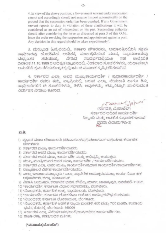 4. ಸರ್ಕಾರದ ಎಲ್ಲಾ ಅಪರ ಮುಖ್ಯಕಾರ್ಯದರ್ಶಿ / ಪ್ರಧಾನಕಾರ್ಯದರ್ಶಿ /ಕಾರ್ಯದರ್ಶಿ ರವರು ತಮ್ಮ ವ್ಯಾಪ್ತಿಯಲ್ಲಿ ಬರುವ ಎಲ್ಲಾ ನೇಮಕಾತಿ ಹಾಗೂ ಶಿಸ್ತು ಪ್ರಾಧಿಕಾರಿಗಳಿಗೆ ಈ ಸೂಚನೆಗಳನ್ನು ತಿಳಿಸಿ, ಅವುಗಳನ್ನು ಕಟ್ಟುನಿಟ್ಟಾಗಿ ಪಾಲಿಸುವಂತೆ ನಿರ್ದೇಶನ ನೀಡಲು ಕೋರಿದೆ.
