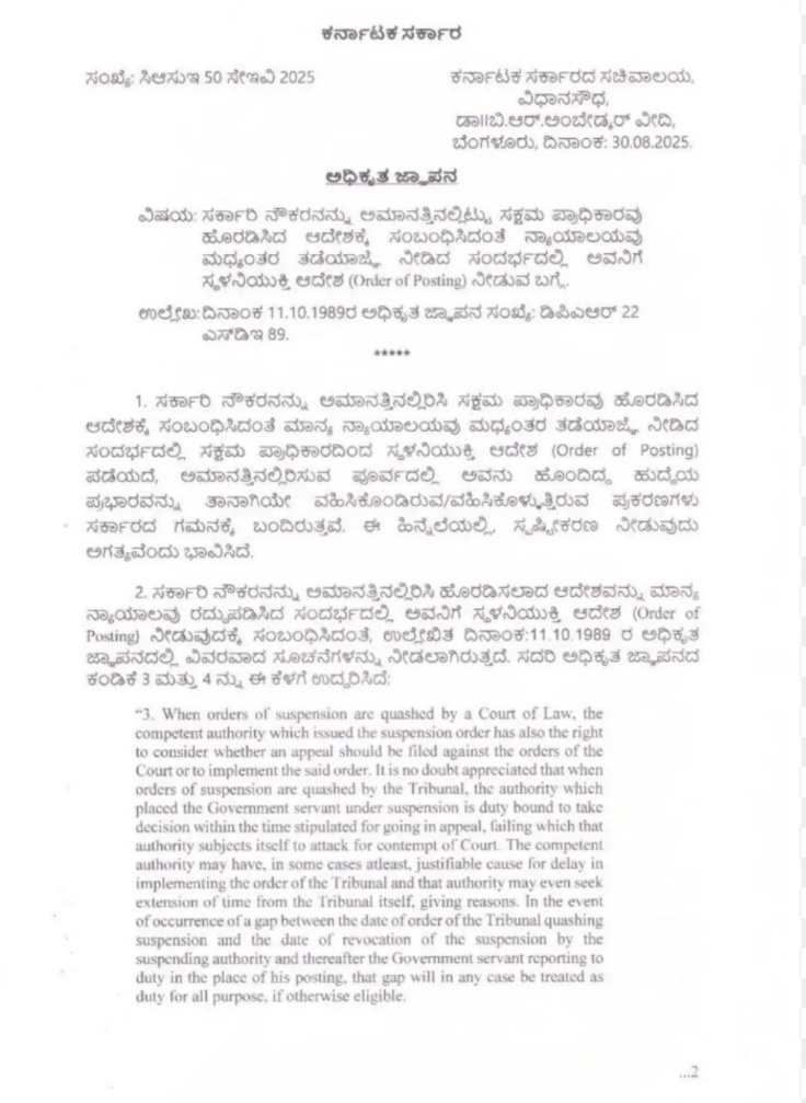 ಬೆಂಗಳೂರು.31.ಆಗಸ್ಟ್.25:- ರಾಜ್ಯ ಸರ್ಕಾರಿ ನೌಕರರ ಸ್ಥಳ ನಿಯುಕ್ತಿ ಆದೇಶ ಕೆ ಸಂಬಂಧಿತ ಕೋರ್ಟ್ ತಡೆಯಾಜ್ಞೆ ನೀಡಿದ  ಹೊರಡಿಸಿದ ಆದೇಶಕ್ಕೆ ಸಂಬಂಧಿಸಿದಂತೆ ನ್ಯಾಯಾಲಯವು ಮಧ್ಯಂತರ ತಡಯಾಜ್ಞೆ ನೀಡಿದ ಸಂದರ್ಭದಲ್ಲಿ ಸರ್ಕಾರಿ ನೌಕರರ ಸ್ಥಳ ನಿಯುಕ್ತಿ ಕುರಿತು ಕರ್ನಾಟಕ ಸರ್ಕಾರ ಮಹತ್ವದ ಆದೇಶ ಹೊರಡಿಸಿದೆ.