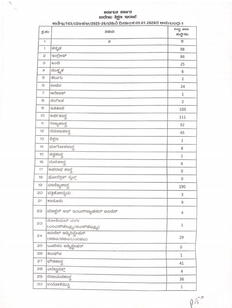 ಬೆಂಗಳೂರು.21.ಜನವರಿ.26: ರಾಜ್ಯ ಸರ್ಕಾರಿ ಪ್ರಥಮ ದರ್ಜೆ ಕಾಲೇಜುಗಳಲ್ಲಿ ವಿವಿಧ ವಿಷಯಗಳ ಸಹಾಯಕ ಪ್ರಾಧ್ಯಾಪಕರ ಹುದ್ದೆಗಳು 5 ವರ್ಷಗಳಿಂದ ಖಾಲಿ ಉಳಿದಿದೆ.