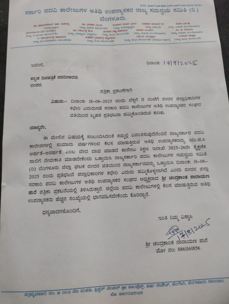 ಮಾನ್ಯರೇ, ಈ ಮೇಲಿನ ವಿಷಯಕ್ಕೆ ಸಂಬಂದಿಸಿದಂತೆ ತಮ್ಮಲ್ಲಿ ವಿನಂತಿಸುವುದೆನೆಂದರೆ ರಾಜ್ಯಸರ್ಕಾರ ಪದವಿ ಕಾಲೇಜಿಗಳಲ್ಲಿ ಸುಮಾರು ವರ್ಷಗಳಿಂದ ಕೆಲಸ ಮಾಡುತ್ತಿರುವ ಅತಿಥಿ ಉಪನ್ಯಾಸಕರನ್ನು ಯು.ಜಿ.ಸಿ. ಆರ್ಹತೆ-ಆನರ್ಹತೆ ಎಂಬ ಬೇದ ಬಾವ ಮಾಡದೆ ಕಾಲೇಜು ಶಿಕ್ಷಣ ಇಲಾಖೆ 2025-26ನೇ ಶೈಕ್ಷಣಿಕ ಸಾಲಿಗೆ ನೇಮಕಾತಿ ಮಾಡಬೇಕೆಂದು ಒತ್ತಾಯಿಸಿ ರಾಜ್ಯಸರ್ಕಾರಿ ಪದವಿ ಕಾಲೇಜುಗಳ ಸಮನ್ವಯ ಸಮಿತಿ (ರಿ) ಬೆಂಗಳೂರು ಜಿಲ್ಲಾ ಘಟಕ ಬೀದರ ವತಿಯಿಂದ ರಾಜ್ಯಸರ್ಕಾರವನ್ನು ಒತ್ತಾಯಿಸಿ ದಿನಾಂಕ: 18-08- 2025 ರಂದು ಪ್ರತಿಭಟನೆ ಜಿಲ್ಲಾಧಿಕಾರಿಗಳ ಕಛೇರಿ ಎದುರು ಹಮ್ಮಿಕೊಳ್ಳಲಾಗಿದೆ ಎಂದು ಬೀದರ ಜಿಲ್ಲಾ ಸರಕಾರಿ ಪದವಿ ಕಾಲೇಜುಗಳ ಅತಿಥಿ ಉಪನ್ಯಾಸಕರ ಸಂಘದ ಅಧ್ಯಕ್ಷರಾದ ಶ್ರೀ ಚಂದ್ರಕಾಂತ ನಾರಾಯಣ ಪುರೆ ಪತ್ರಿಕಾ ಪ್ರಕಟನೆಯಲ್ಲಿ ತಿಳಿಸಿರುತ್ತಾರೆ.
