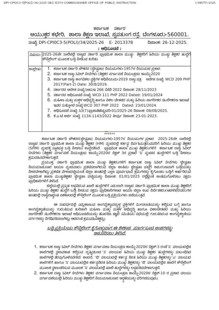 ಈ ಕುರಿತಂತೆ ಶಾಲಾ ಶಿಕ್ಷಣ ಇಲಾಖೆಯ ಆಯುಕ್ತರು ಅಧಿಸೂಚನೆ ಹೊರಡಿಸಿದ್ದು, ಕರ್ನಾಟಕ ಸರ್ಕಾರಿ ನೌಕರರ(ಜೇಷ್ಟತಾ) ನಿಯಮಗಳು-1957ರ ನಿಯಮಗಳ ಪ್ರಕಾರ 2025-26ನೇ ಸಾಲಿನಲ್ಲಿ ರಾಜ್ಯದ ಸರ್ಕಾರಿ ಪ್ರಾಥಮಿಕ ಶಾಲಾ ಮುಖ್ಯ ಶಿಕ್ಷಕರ (HM) ವೃಂದದಲ್ಲಿ ಕರ್ತವ್ಯ ನಿರ್ವಹಿಸುತ್ತಿರುವವರಿಗೆ ಹಿರಿಯ ಮುಖ್ಯ ಶಿಕ್ಷಕರ (SHM) ವೃಂದಕ್ಕೆ ಸ್ಥಾನಪನ್ನ ಬಡ್ತಿ ನೀಡಲು ಉದ್ದೇಶಿಸಿದೆ. ಪ್ರಾಥಮಿಕ ಶಾಲಾ ಮುಖ್ಯ ಶಿಕ್ಷಕರುಗಳಿಗೆ ಕರ್ನಾಟಕ ರಾಜ್ಯ ಸಿವಿಲ್ ಸೇವೆಗಳು (ಶಿಕ್ಷಕರ ವರ್ಗಾವಣೆ ನಿಯಂತ್ರಣ) ಕಾಯ್ದೆ-2020ರ ಸೆಕ್ಷನ್ 3ರ ಪ್ರಕಾರೆ ‘ಸಿ’ ವೃಂದದ ಹುದ್ದೆಗಳಿಗೆ ಬಡ್ತಿ ನೀಡಲು ಕ್ರಮವಹಿಸಬೇಕಾಗುತ್ತದೆ ಎಂದಿದ್ದಾರೆ.