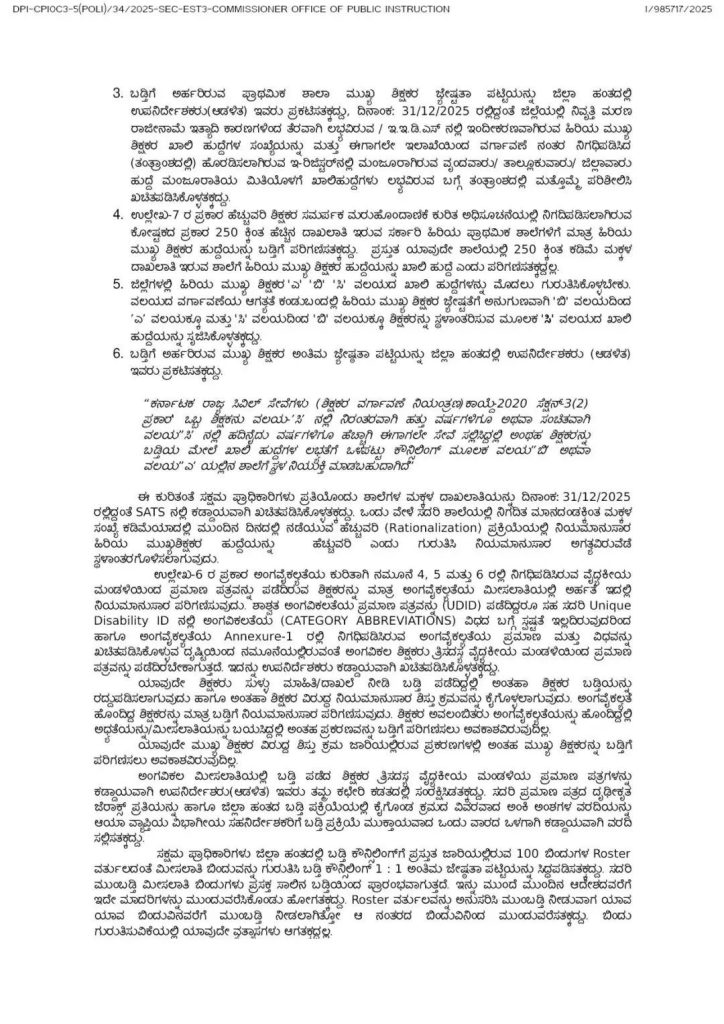 3. ಬಡ್ತಿಗೆ ಅರ್ಹರಿರುವ ಪ್ರಾಥಮಿಕ ಶಾಲಾ ಮುಖ್ಯ ಶಿಕ್ಷಕರ ಜೇಷ್ಟತಾ ಪಟ್ಟಿಯನ್ನು ಜಿಲ್ಲಾ ಹಂತದಲ್ಲಿ ಉಪನಿರ್ದೇಶಕರು(ಆಡಳಿತ) ಇವರು ಪ್ರಕಟಿಸತಕ್ಕದ್ದು, ದಿನಾಂಕ: 31/12/2025 ರಲ್ಲಿದ್ದಂತೆ ಜಿಲ್ಲೆಯಲ್ಲಿ ನಿವೃತ್ತಿ ಮರಣ ರಾಜೀನಾಮೆ ಇತ್ಯಾದಿ ಕಾರಣಗಳಿಂದ ತೆರವಾಗಿ ಲಭ್ಯವಿರುವ / ಇ.ಇ.ಡಿ.ಎಸ್ ನಲ್ಲಿ ಇಂದೀಕರಣವಾಗಿರುವ ಹಿರಿಯ ಮುಖ್ಯ ಶಿಕ್ಷಕರ ಖಾಲಿ ಹುದ್ದೆಗಳ ಸಂಖ್ಯೆಯನ್ನು ಮತ್ತು ಈಗಾಗಲೇ ಇಲಾಖೆಯಿಂದ ವರ್ಗಾವಣೆ ನಂತರ ನಿಗಧಿಪಡಿಸಿದ (ತಂತ್ರಾಂಶದಲ್ಲಿ) ಹೊರಡಿಸಲಾಗಿರುವ ಇ-ರಿಜಿಸ್ಟರ್ನಲ್ಲಿ ಮಂಜೂರಾಗಿರುವ ವೃಂದವಾರು ತಾಲ್ಲೂಕುವಾರು/ ಜಿಲ್ಲಾವಾರು ಹುದ್ದೆ ಮಂಜೂರಾತಿಯ ಮಿತಿಯೊಳಗೆ ಖಾಲಿಹುದ್ದೆಗಳು ಲಭ್ಯವಿರುವ ಬಗ್ಗೆ ತಂತ್ರಾಂಶದಲ್ಲಿ ಮತ್ತೊಮ್ಮೆ ಪರಿಶೀಲಿಸಿ ಖಚಿತಪಡಿಸಿಕೊಳ್ಳತಕ್ಕದ್ದು.