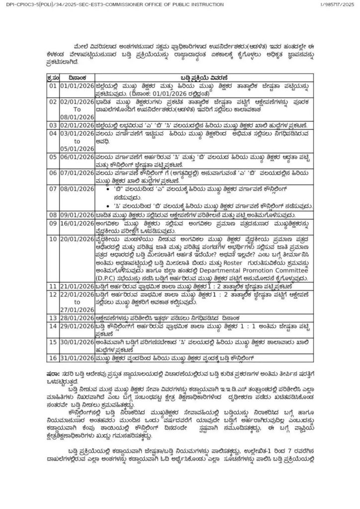 ಪ್ರಯುಕ್ತ, ಸರ್ಕಾರಿ ಪ್ರಾಥಮಿಕ ಶಾಲಾ ಮುಖ್ಯ ಶಿಕ್ಷಕರುಗಳಿಗೆ ಕರ್ನಾಟಕ ರಾಜ್ಯ ಸಿವಿಲ್ ಸೇವೆಗಳು ಜೇಷ್ಟತಾ ನಿಯಮಾನುಸಾರ ಆಯಾ ವೃಂದವಾರು ಪ್ರಕಟಿಸಲಾಗಿರುವ ಜಿಲ್ಲಾ ಅಂತಿಮ ಜೇಷ್ಟತಾ ಪಟ್ಟಿಗೆ ಅನುಗುಣವಾಗಿ ಬಡ್ತಿಯನ್ನು ನೀಡಬೇಕಾಗಿದ್ದು ಪ್ರಕಟಿತ ವೇಳಾಪಟ್ಟಿಯಂತೆ ಜಿಲ್ಲಾ ಹಂತದಲ್ಲಿ ಎಲ್ಲಾ ಪೂರ್ವಭಾವಿ ಕ್ರಮಗಳನ್ನು ಕೈಗೊಂಡು ಬಡ್ತಿಗೆ ಅರ್ಹರಿರುವ ಪ್ರಾಥಮಿಕ ಶಾಲಾ ಮುಖ್ಯಶಿಕ್ಷಕರ ಜೇಷ್ಟತಾ ಪಟ್ಟಿಯನ್ನು ದಿನಾಂಕ: 01/01/2025 ರಲ್ಲಿದ್ದಂತೆ ಅಂತಿಮಗೊಳಿಸಲು ಸಕ್ಷಮ ಪ್ರಾಧಿಕಾರಿಗಳಿಗೆ ತಿಳಿಸಿದ್ದಾರೆ.