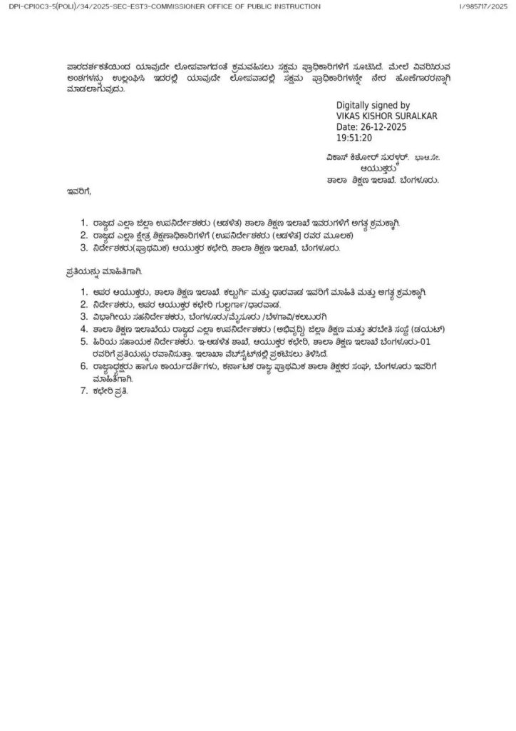 02/01/2026 : 08/01/2026- ಭಾದಿತ ಮುಖ್ಯ ಶಿಕ್ಷಕರುಗಳು ಪ್ರಕಟಿತ ತಾತ್ಕಾಲಿಕ ಜೇಷ್ಟತಾ ಪಟ್ಟಿಗೆ ಆಕ್ಷೇಪಣೆಗಳನ್ನು ಪೂರಕ To ದಾಖಲೆಗಳೊಂದಿಗೆ ಉಪನಿರ್ದೇಶಕರು(ಆಡಳಿತ) ಇವರಿಗೆ ಸಲ್ಲಿಸಲು ಕಾಲಾವಕಾಶ.