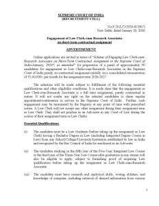 ಹೊಸ ದೆಹಲಿ.21.ಜನವರಿ.26: ಭಾರತದ ಸರ್ವೋಚ್ಚ ನ್ಯಾಯಾಲಯದಲ್ಲಿ  2026-27ನೇ ಸಾಲಿಗೆ ಗುತ್ತಿಗೆ ಆಧಾರದ ಮೇಲೆ ವಿವಿಧ ಕಾನೂನು ಗುಮಾಸ್ತ ಕಮ್ ಸಂಶೋಧನಾ ಸಹವರ್ತಿ ಹುದ್ದೆಗಳ ನೇಮಕಾತಿಗೆ ಅರ್ಹ ಅಭ್ಯರ್ಥಿಗಳಿಂದ ಅರ್ಜಿಗಳನ್ನು ಆಹ್ವಾನಿಸಲಾಗಿದೆ.
