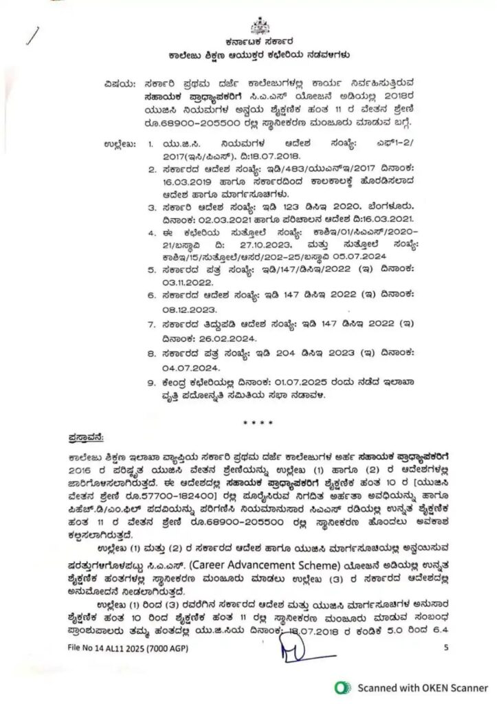 ಕಾಲೇಜು ಶಿಕ್ಷಣ ಇಲಾಖಾ ವ್ಯಾಪ್ತಿಯ ಸರ್ಕಾರಿ ಪ್ರಥಮ ದರ್ಜೆ ಕಾಲೇಜುಗಳ ಅರ್ಹ ಸಹಾಯಕ ಪ್ರಾಧ್ಯಾಪಕರಿಗೆ 2016 ರ ಪರಿಷ್ಕೃತ ಯುಜಿಸಿ ವೇತನ ಶ್ರೇಣಿಯನ್ನು ಉಲ್ಲೇಖ (1) ಹಾಗೂ (2) ರ ಆದೇಶಗಳಲ್ಲಿ ಜಾರಿಗೊಳಿಸಲಾಗಿರುತ್ತದೆ. ಈ ಆದೇಶದಲ್ಲಿ ಸಹಾಯಕ ಪ್ರಾಧ್ಯಾಪಕರಿಗೆ ಶೈಕ್ಷಣಿಕ ಹಂತ 10 ರ [ಯುಜಿಸಿ ವೇತನ ಶ್ರೇಣಿ ರೂ.57700-182400] ರಲ್ಲಿ ಪೂರೈಸಿರುವ ನಿಗದಿತ ಅರ್ಹತಾ ಅವಧಿಯನ್ನು ಹಾಗೂ ಪಿಹೆಚ್.ಡಿ/ಎಂ.ಫಿಲ್ ಪದವಿಯನ್ನು ಪರಿಗಣಿಸಿ ನಿಯಮಾನುಸಾರ ಸಿಎಎಸ್ ರಡಿಯಲ್ಲಿ ಉನ್ನತ ಶೈಕ್ಷಣಿಕ ಹಂತ 11 ರ ವೇತನ ಶ್ರೇಣಿ ರೂ.68900-205500 ರಲ್ಲಿ ಸ್ಥಾನೀಕರಣ ಹೊಂದಲು ಅವಕಾಶ ಕಲ್ಪಿಸಲಾಗಿರುತ್ತದೆ.