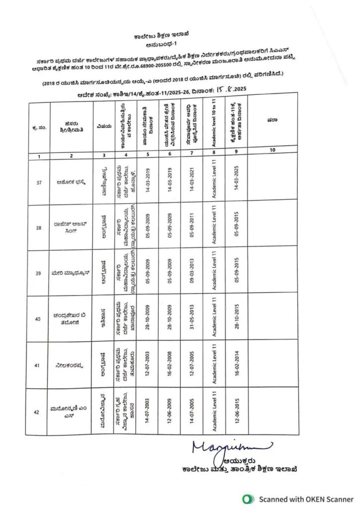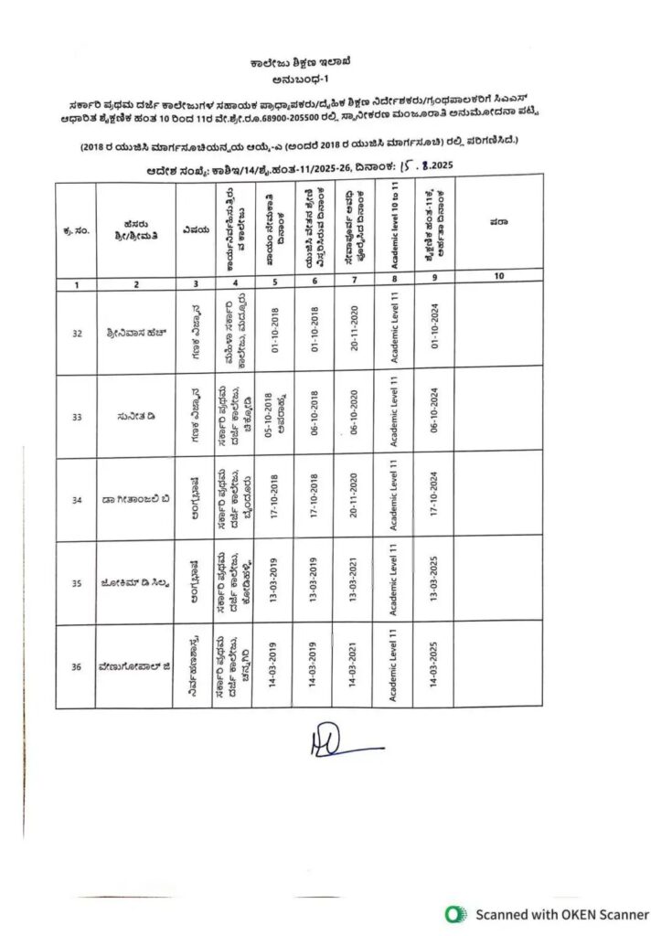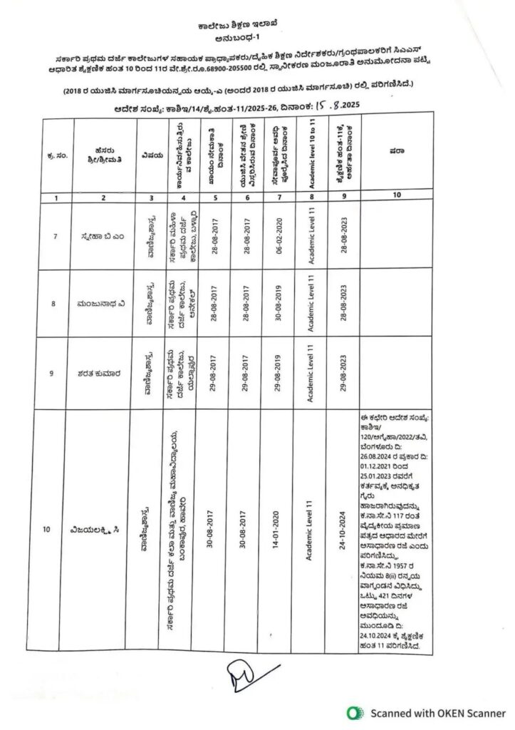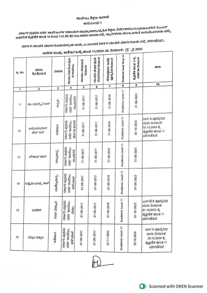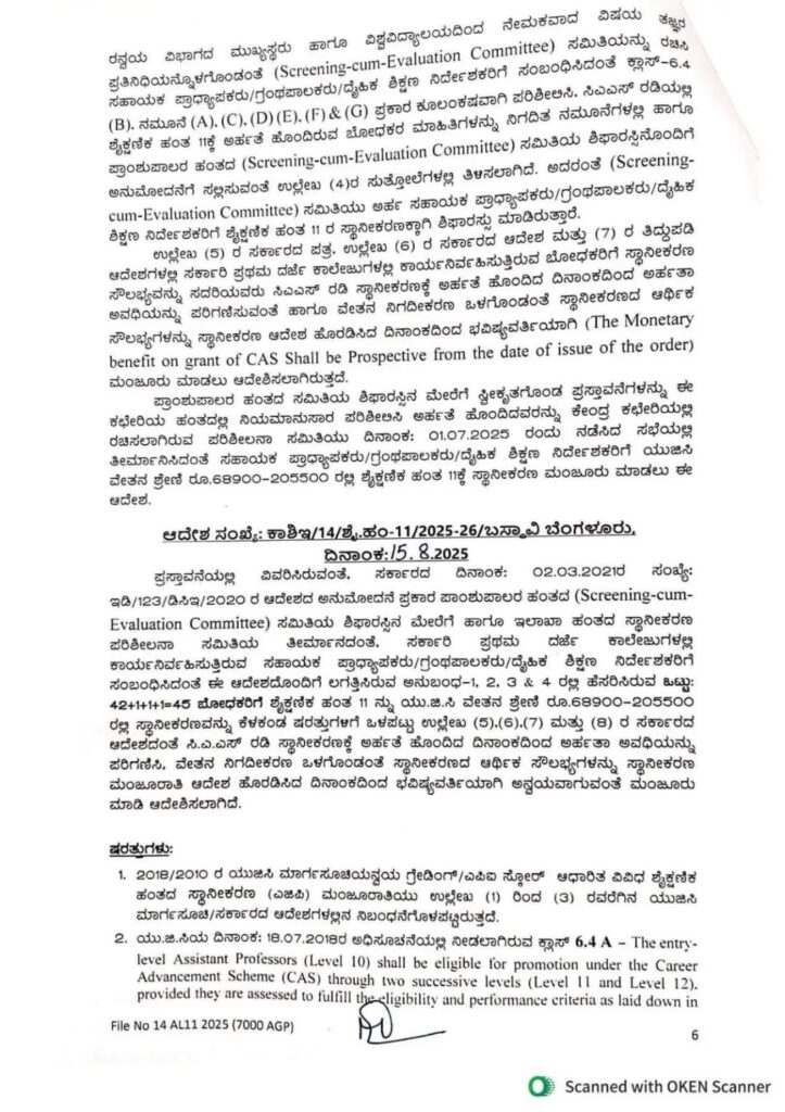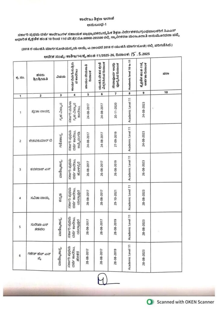 ಪ್ರಾಂಶುಪಾಲರ ಹಂತದ ಸಮಿತಿಯ ಶಿಫಾರಸ್ಸಿನ ಮೇರೆಗೆ ಸ್ವೀಕೃತಗೊಂಡ ಪ್ರಸ್ತಾವನೆಗಳನ್ನು ಈ ಕಛೇರಿಯ ಹಂತದಲ್ಲಿ ನಿಯಮಾನುಸಾರ ಪರಿಶೀಲಿಸಿ ಅರ್ಹತೆ ಹೊಂದಿದವರನ್ನು ಕೇಂದ್ರ ಕಛೇರಿಯಲ್ಲಿ ರಚಿಸಲಾಗಿರುವ ಪರಿಶೀಲನಾ ಸಮಿತಿಯು ದಿನಾಂಕ: 01.07.2025 ರಂದು ನಡೆಸಿದ ಸಭೆಯಲ್ಲಿ ತೀರ್ಮಾನಿಸಿದಂತೆ ಸಹಾಯಕ ಪ್ರಾಧ್ಯಾಪಕರು/ಗ್ರಂಥಪಾಲಕರು/ದೈಹಿಕ ಶಿಕ್ಷಣ ನಿರ್ದೇಶಕರಿಗೆ ಯುಜಿಸಿ ವೇತನ ಶ್ರೇಣಿ ರೂ.68900-205500 ರಲ್ಲಿ ಶೈಕ್ಷಣಿಕ ಹಂತ 11ಕ್ಕೆ ಸ್ಥಾನೀಕರಣ ಮಂಜೂರು ಮಾಡಲು ಈ ಆದೇಶ.