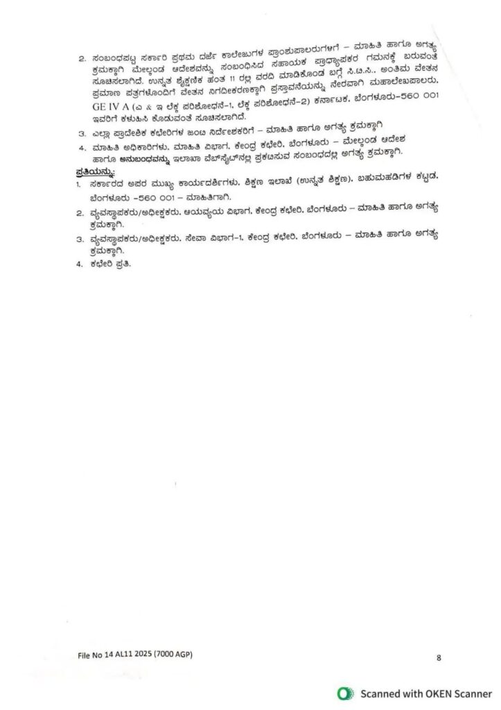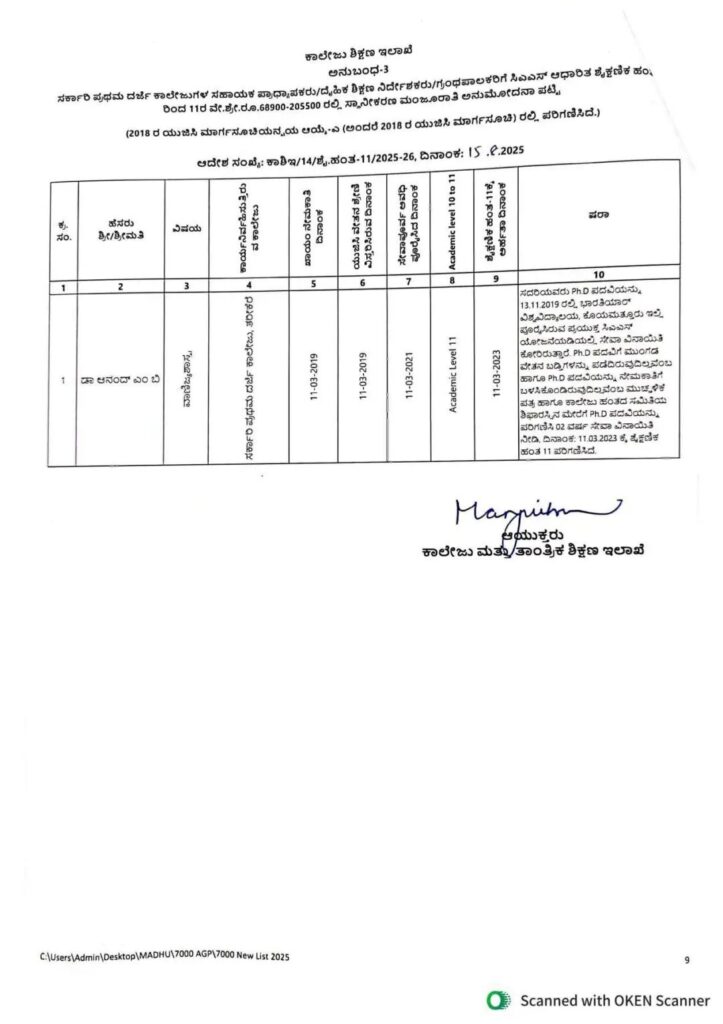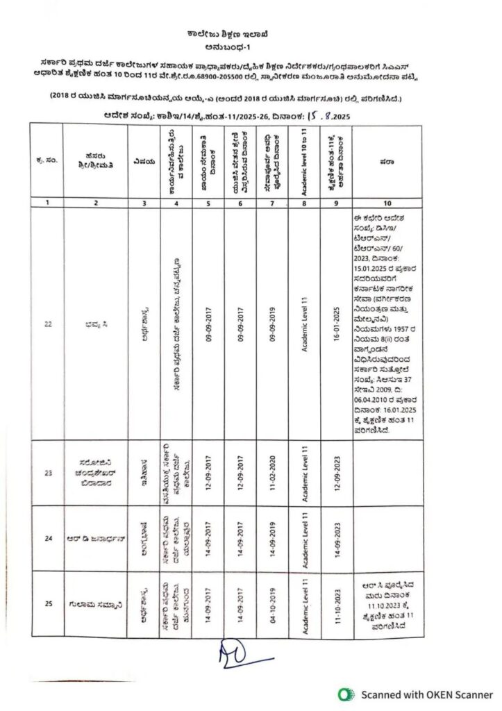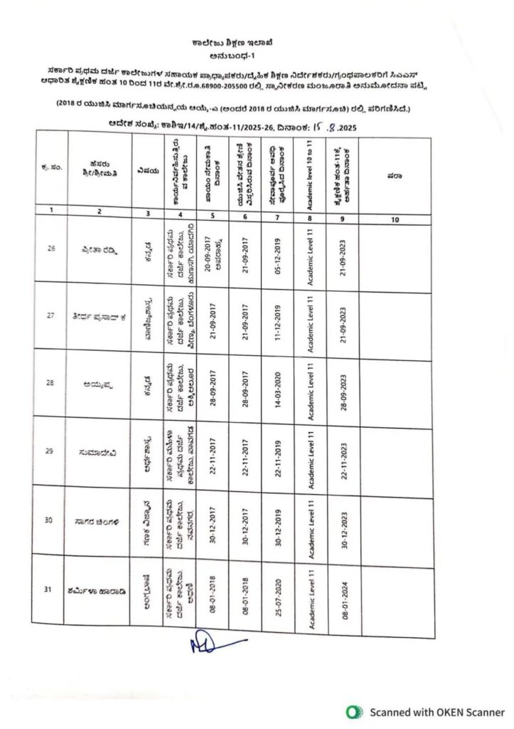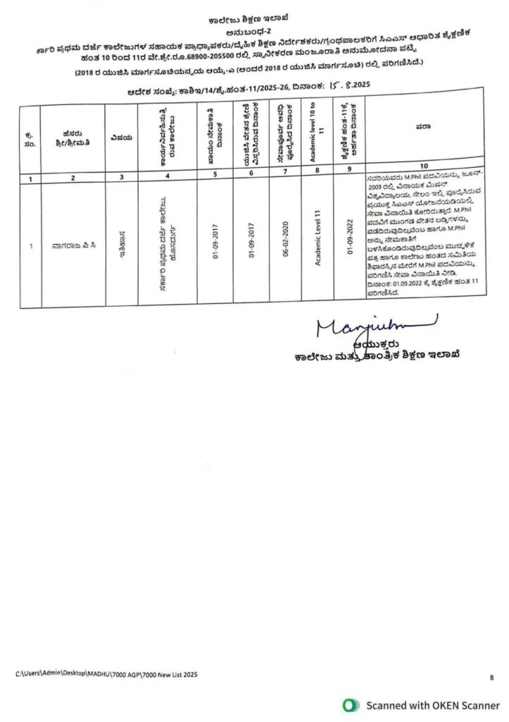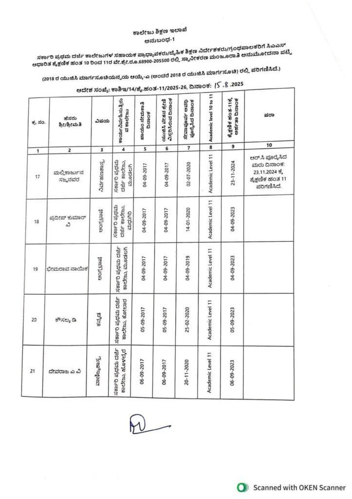 ಪ್ರಾಂಶುಪಾಲರ ಹಂತದ ಸಮಿತಿಯ ಶಿಫಾರಸ್ಸಿನ ಮೇರೆಗೆ ಸ್ವೀಕೃತಗೊಂಡ ಪ್ರಸ್ತಾವನೆಗಳನ್ನು ಈ ಕಛೇರಿಯ ಹಂತದಲ್ಲಿ ನಿಯಮಾನುಸಾರ ಪರಿಶೀಲಿಸಿ ಅರ್ಹತೆ ಹೊಂದಿದವರನ್ನು ಕೇಂದ್ರ ಕಛೇರಿಯಲ್ಲಿ ರಚಿಸಲಾಗಿರುವ ಪರಿಶೀಲನಾ ಸಮಿತಿಯು ದಿನಾಂಕ: 01.07.2025 ರಂದು ನಡೆಸಿದ ಸಭೆಯಲ್ಲಿ ತೀರ್ಮಾನಿಸಿದಂತೆ ಸಹಾಯಕ ಪ್ರಾಧ್ಯಾಪಕರು/ಗ್ರಂಥಪಾಲಕರು/ದೈಹಿಕ ಶಿಕ್ಷಣ ನಿರ್ದೇಶಕರಿಗೆ ಯುಜಿಸಿ ವೇತನ ಶ್ರೇಣಿ ರೂ.68900-205500 ರಲ್ಲಿ ಶೈಕ್ಷಣಿಕ ಹಂತ 11ಕ್ಕೆ ಸ್ಥಾನೀಕರಣ ಮಂಜೂರು ಮಾಡಲು ಈ ಆದೇಶ.