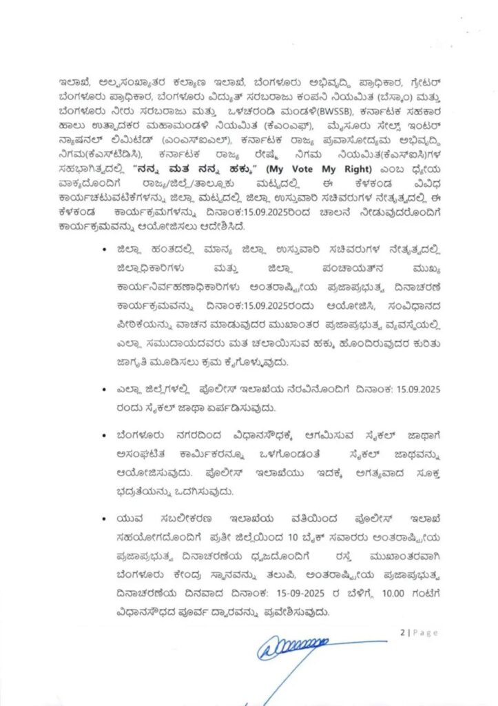 ನಾಗರಿಕರ ಜವಾಬ್ದಾರಿ ಮತ್ತು ಸಾರ್ವಜನಿಕರ ಪಾಲ್ಗೊಳ್ಳುವಿಕೆಯನ್ನು ಉತ್ತೇಜಿಸುವ ನಿಟ್ಟಿನಲ್ಲಿ, ಜಿಲ್ಲಾಡಳಿತಗಳ ನೇತೃತ್ವದಲ್ಲಿ ಪ್ರತಿ ಜಿಲ್ಲೆಯಲ್ಲಿಯೂ ಸೈಕಲ್ ಜಾಥಾವನ್ನು ಆಯೋಜಿಸಲಾಗಿದೆ. ಇದರ ಜೊತೆಗೆ, ಪ್ರಜಾಪ್ರಭುತ್ವ ಮತ್ತು ಏಕತೆಯ ಸಂದೇಶಗಳನ್ನು ಹೊತ್ತ ಬೈಕ್ ಸವಾರರು, ಎಲ್ಲಾ ಜಿಲ್ಲಾ ಕೇಂದ್ರಗಳಿಂದ ಬೆಂಗಳೂರಿನವರೆಗೆ ಬೈಕ್ ಜಾಥಾ ನಡೆಸಲಿದ್ದಾರೆ. ಯುವ ಸಬಲೀಕರಣ ಮತ್ತು ಕ್ರೀಡಾ ಇಲಾಖೆಯ ಆಶ್ರಯದಲ್ಲಿ ಈ ಜಾಥಾ ನಡೆಯಲಿದ್ದು, ಬೆಂಗಳೂರು ಅಭಿವೃದ್ಧಿ ಪ್ರಾಧಿಕಾರವು ತನ್ನ ವ್ಯಾಪ್ತಿಯಲ್ಲಿ ಜಾಥಾಗೆ ಸಂಬಂಧಿಸಿದಂತೆ ಸಮನ್ವಯ ಸಾಧಿಸಲಿದೆ.
