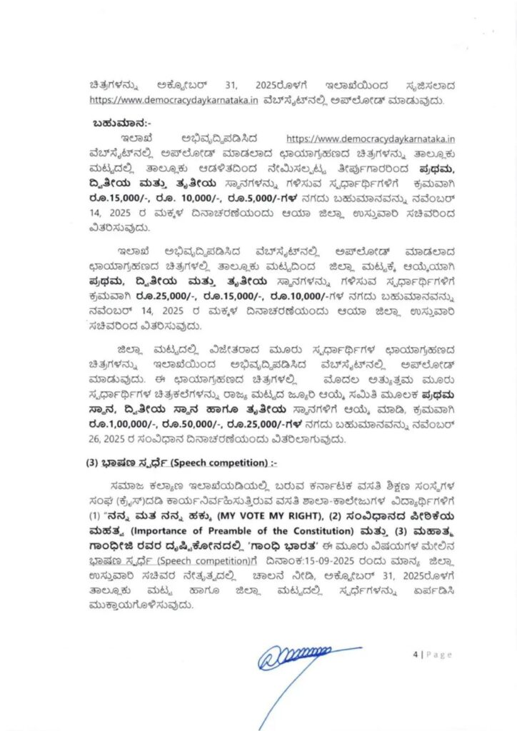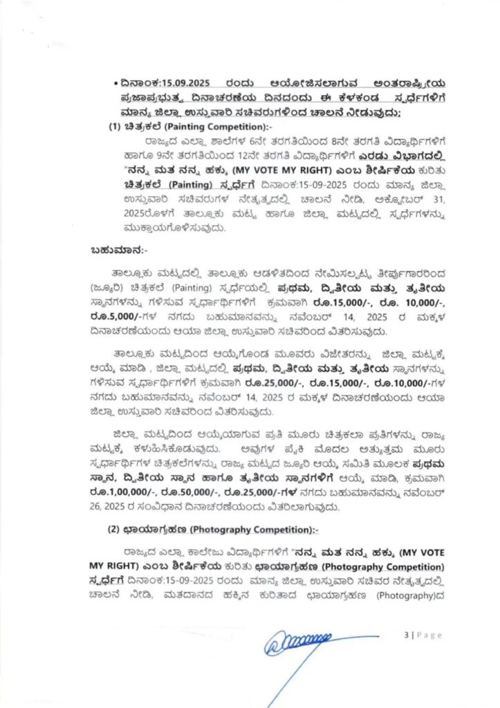 ಪ್ರಜಾಪ್ರಭುತ್ವದ ಮೌಲ್ಯಗಳ ಬಗ್ಗೆ ಸೃಜನಶೀಲ ಅಭಿವ್ಯಕ್ತಿಯನ್ನು ಉತ್ತೇಜಿಸುವ ಸಲುವಾಗಿ, ಶಾಲಾ ಶಿಕ್ಷಣ ಮತ್ತು ಸಾಕ್ಷರತಾ ಇಲಾಖೆಯ ನೇತೃತ್ವದಲ್ಲಿ ಹಾಗೂ ಲಿಡ್ಕರ್ ಪ್ರಾಯೋಜಕತ್ವದಲ್ಲಿ ತಾಲ್ಲೂಕು, ಜಿಲ್ಲೆ ಮತ್ತು ರಾಜ್ಯ ಮಟ್ಟದಲ್ಲಿ ಶಾಲಾ ವಿದ್ಯಾರ್ಥಿಗಳಿಗೆ ಚಿತ್ರಕಲಾ ಸ್ಪರ್ಧೆಯನ್ನು ಆಯೋಜಿಸಲಾಗಿದೆ. ದೈನಂದಿನ ಜೀವನದಲ್ಲಿ ಪ್ರಜಾಪ್ರಭುತ್ವದ ಪಾತ್ರವನ್ನು ಚಿತ್ರಗಳ ಮೂಲಕ ಪ್ರದರ್ಶಿಸಲು, ಉನ್ನತ ಶಿಕ್ಷಣ ಇಲಾಖೆಯು ಛಾಯಾಚಿತ್ರ ಸ್ಪರ್ಧೆಯನ್ನು ಏರ್ಪಡಿಸಿದೆ. ಕರ್ನಾಟಕ ವಸತಿ ಶಿಕ್ಷಣ ಇಲಾಖೆಯ ವತಿಯಿಂದ ವಿದ್ಯಾರ್ಥಿಗಳಿಗಾಗಿ ಭಾಷಣ ಸ್ಪರ್ಧೆಯನ್ನು ಆಯೋಜಿಸಲಾಗಿದ್ದು, “ನನ್ನ ಮತ ನನ್ನ ಹಕ್ಕು,” “ಸಂವಿಧಾನದ ಪೀಠಿಕೆ,” ಮತ್ತು “ಮಹಾತ್ಮ ಗಾಂಧೀಜಿಯವರ ದೃಷ್ಟಿಯಲ್ಲಿ ಗಾಂಧಿ ಭಾರತ” ಎಂಬ ವಿಷಯಗಳ ಮೇಲೆ ಸ್ಪರ್ಧೆ ನಡೆಯಲಿದೆ. ರಾಜ್ಯಮಟ್ಟದ ಸ್ಪರ್ಧೆಯಲ್ಲಿ ಪ್ರಥಮ ಬಹುಮಾನವಾಗಿ 1 ಲಕ್ಷ ರೂ., ದ್ವಿತೀಯ ಬಹುಮಾನವಾಗಿ 50 ಸಾವಿರ ರೂ., ಮತ್ತು ತೃತೀಯ ಬಹುಮಾನವಾಗಿ 25 ಸಾವಿರ ರೂ. ಗಳನ್ನು ಘೋಷಿಸಲಾಗಿದೆ.