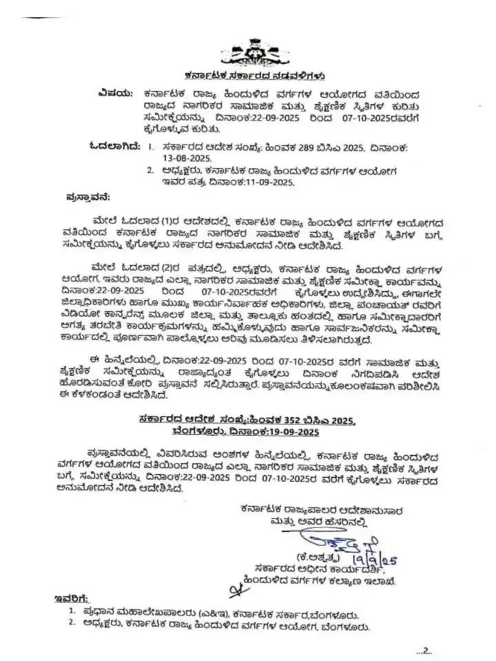 ಪುಸ್ತಾವನೆಯಲ್ಲಿ ವಿವರಿಸಿರುವ ಅಂಶಗಳ ಹಿನ್ನಲೆಯಲ್ಲಿ, ಕರ್ನಾಟಕ ರಾಜ್ಯ ಹಿಂದುಳಿದ ವರ್ಗಗಳ ಆಯೋಗದ ವತಿಯಿಂದ ರಾಜ್ಯದ ಎಲ್ಲಾ ನಾಗರಿಕರ ಸಾಮಾಜಿಕ ಮತ್ತು ಶೈಕ್ಷಣಿಕ ಸ್ಥಿತಿಗಳ ಬಗ್ಗೆ ಸಮೀಕ್ಷೆಯನ್ನು ದಿನಾಂಕ:22-09-2025 ರಿಂದ 07-10-2025ರ ವರೆಗೆ ಕೈಗೊಳ್ಳಲು ಸರ್ಕಾರದ ಅನುಮೋದನೆ ನೀಡಿ ಆದೇಶಿಸಿದೆ ಎಂದು ಹೇಳಿದೆ.