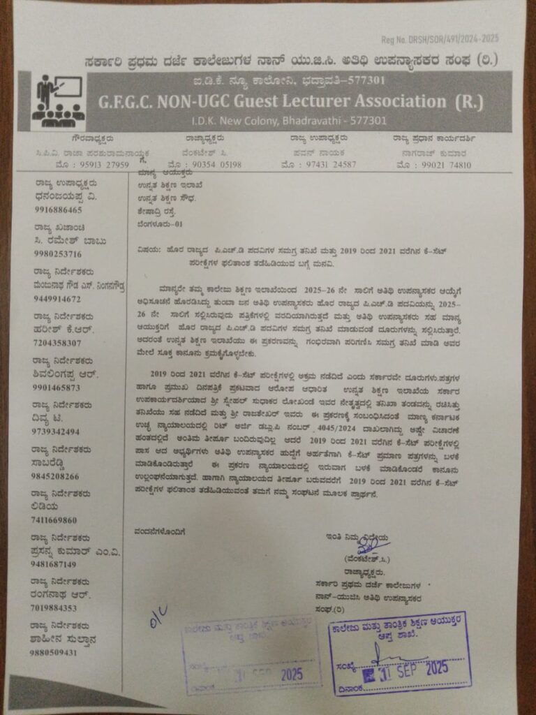 ಬೆಂಗಳೂರು.01.ಸೆಪ್ಟೆಂಬರ್.25:- ಸರ್ಕಾರಿ ಪ್ರಥಮ ದರ್ಜೆ ಕಾಲೇಜುಗಳಲ್ಲಿ ಕಾರ್ಯ ನಿರ್ವಹಿಸಿರುವ ಸರ್ಕಾರಿ ಪ್ರಥಮ ದರ್ಜೆ ಕಾಲೇಜುಗಳ ನಾನ್ ಯುಜಿಸಿ ಅತಿಥಿ ಉಪನ್ಯಾಸಕರ ಸಂಘ ವತಿಯಿಂದ ಕಾಲೇಜು ಶಿಕ್ಷಣ ಇಲಾಖೆ ಆಯುಕ್ತರಿಗೆ ದೂರು ಸಲ್ಲಿಸಿದರೆ.