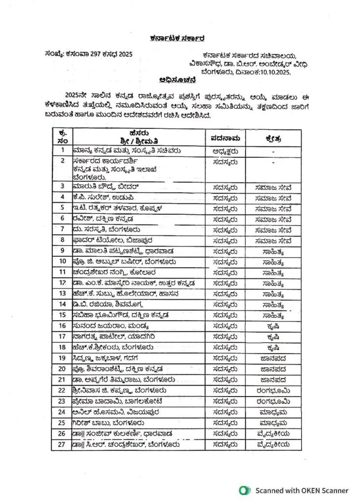 ಬೆಂಗಳೂರು.10.ಆಕ್ಟೋಬರ.25:-  2025ನೇ ಸಾಲಿನ ಕನ್ನಡ ರಾಜ್ಯೋತ್ಸವ ಪ್ರಶಸ್ತಿ ಪುರಸ್ಕೃತರ ಆಯ್ಕೆಗೆ ಸಲಹಾ ಸಮಿತಿಯನ್ನು ರಚಿಸಿ ರಾಜ್ಯ ಸರ್ಕಾರದಿಂದ ಆದೇಶಿಸಿದೆ.