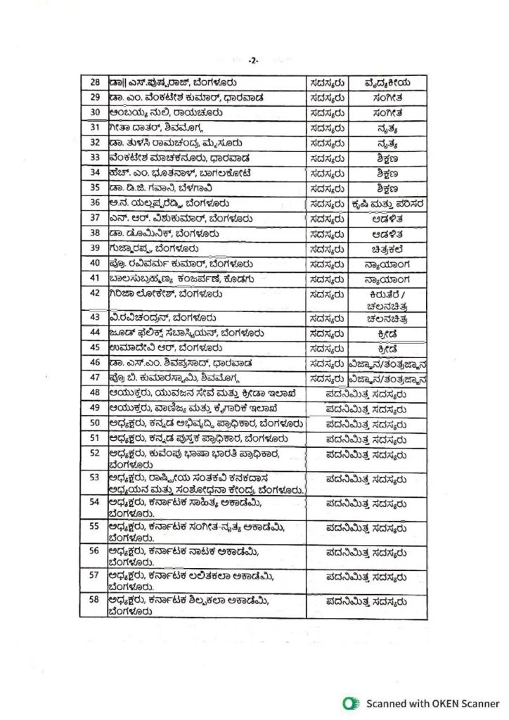 ಸಾಹಿತ್ಯ ಕ್ಷೇತ್ರದಿಂದ ಸದಸ್ಯರನ್ನಾಗಿ ಧಾರವಾಡದ ಡಾ.ಮಾಲತಿ ಪಟ್ಟಣಶೆಟ್ಟಿ, ಬೆಂಗಳೂರಿನ ಪ್ರೊ.ಜಿ.ಅಬ್ದುಲ್ ಬಷೀರ್, ಕೋಲಾರದ ಚಂದ್ರಶೇಖರ ನಂಗ್ಲಿ, ಉತ್ತರ ಕನ್ನಡದ ಡಾ.ಎಂಕೆ ಮಾಸ್ಕೇರಿ ನಾಯಕ್, ಹಾಸನದ ಹೆಚ್.ಕೆ ಸುಬ್ಬು ಹೊಲೇಯಾರ್, ಶಿವಮೊಗ್ಗದ ಡಿ.ಬಿ ರಜಿಯಾ, ದಕ್ಷಿಣ ಕನ್ನಡದ ಸಬಿಹಾ ಭೂಮಿಗೌಡ ಅವರನ್ನು ನೇಮಕ ಮಾಡಲಾಗಿದೆ.