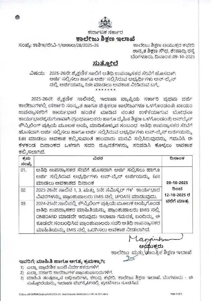 2025-26ನೇ ಶೈಕ್ಷಣಿಕ ಸಾಲಿನಲ್ಲಿ ಇಲಾಖಾ ವ್ಯಾಪ್ತಿಯ ಸರ್ಕಾರಿ ಪ್ರಥಮ ದರ್ಜೆ ಕಾಲೇಜುಗಳಲ್ಲಿ (ಸರ್ಕಾರಿ ಸಂಸ್ಕೃತ ಹಾಗೂ ಚಿತ್ರಕಲಾ ಕಾಲೇಜುಗಳೂ ಒಳಗೊಂಡಂತೆ) ಖಾಯಂ ಉಪನ್ಯಾಸಕರಿಗೆ ಕಾರ್ಯಭಾರ ಹಂಚಿಕೆ ಮಾಡಿದ ನಂತರ ಉಳಿಕೆಯಾಗುವ ಬೋಧನಾ ಕಾರ್ಯಭಾರಕ್ಕನುಗುಣವಾಗಿ (ಗ್ರಂಥಪಾಲಕರು ಹಾಗೂ ದೈಹಿಕ ಶಿಕ್ಷಣ ಒಳಗೊಂಡಂತೆ) ಆನ್ಲೈನ್ ಕೌನ್ಸಿಲಿಂಗ್ ಪ್ರಕ್ರಿಯೆ ಮೂಲಕ ಆಯ್ಕೆ ಮಾಡಿಕೊಳ್ಳುವ ಸಂಬಂಧ ಅತಿಥಿ ಉಪನ್ಯಾಸಕರ ಸೇವೆಗೆ ಹೊಸದಾಗಿ ಅರ್ಜಿ ಸಲ್ಲಿಸಲು ಹಾಗೂ ಅರ್ಜಿ ಸಲ್ಲಿಸಿರುವ ಅಭ್ಯರ್ಥಿಗಳು ಅನ್-ಲೈನ್ ಅರ್ಜಿಯನ್ನು Edit ಮಾಡಲು ಅವಕಾಶ ಕಲ್ಪಿಸುವಂತೆ ಹಲವಾರು ಮನವಿ ಸಲ್ಲಿಸಿರುವುದನ್ನು ಗಮನಿಸಿ ಈ ಕೆಳಕಂಡ ದಿನಾಂಕದ ಒಳಗಾಗಿ ಸದರಿ ನ್ಯೂನತೆಗಳನ್ನು ಸರಿಪಡಿಸಿ ಕೊಳ್ಳಲು ಅವಕಾಶ ಕಲ್ಪಿಸಲಾಗಿದೆ.