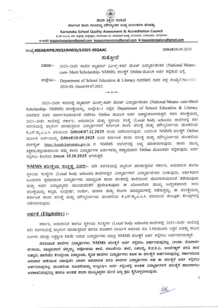 ಸದರಿ ಪರೀಕ್ಷೆಯನ್ನು 2025-26ನೇ ಸಾಲಿನಲ್ಲಿ ಸರ್ಕಾರಿ, ಅನುದಾನಿತ ಮತ್ತು ಸ್ಥಳೀಯ ಸಂಸ್ಥೆ (Local body schools) ಶಾಲೆಗಳಲ್ಲಿ 8ನೇ ತರಗತಿಯಲ್ಲಿ ವ್ಯಾಸಂಗ ಮಾಡುತ್ತಿರುವ ವಿದ್ಯಾರ್ಥಿಗಳಿಗೆ ಕರ್ನಾಟಕ ಶಾಲಾ ಪರೀಕ್ಷೆ ಮತ್ತು ಮೌಲ್ಯನಿರ್ಣಯ ಮಂಡಲಿಯ ಕೆ.ಎಸ್.ಕ್ಯು.ಎ.ಎ.ಸಿ ವತಿಯಿಂದ ದಿನಾಂಕ:07.12.2025 ರಂದು ನಡೆಸಲಾಗುವುದು. ಅದರಂತೆ NMMS ಪರೀಕ್ಷೆಗೆ Online ಮೂಲಕ ಅರ್ಜಿಯನ್ನು ದಿನಾಂಕ:10.09.2025 ರಿಂದ ಕರ್ನಾಟಕ ಶಾಲಾ ಪರೀಕ್ಷೆ ಮತ್ತು ಮೌಲ್ಯನಿರ್ಣಯ ಮಂಡಲಿಯ ವೆಬ್ ಸೈಟ್ https://kscab.karnataka.gov.in ನ NMMS ಲಾಗಿನ್ನಲ್ಲಿ ಲಭ್ಯ ಮಾಡಲಾಗುವುದು. ಶಾಲಾ ಮುಖ್ಯ ಶಿಕ್ಷಕರು/ಪ್ರಾಂಶುಪಾಲರು ತಮ್ಮ ಶಾಲಾ ವಿದ್ಯಾರ್ಥಿಗಳ ಅರ್ಜಿಗಳನ್ನು ಕಡ್ಡಾಯವಾಗಿ Online ಮೂಲಕವೇ ಸಲ್ಲಿಸುವುದು. ಅರ್ಜಿ ಸಲ್ಲಿಸಲು ಕೊನೆಯ ದಿನಾಂಕ: 15.10.2025 ಆಗಿರುತ್ತದೆ.