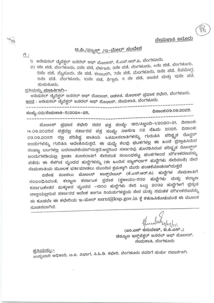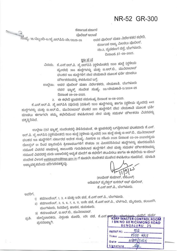ಉಲ್ಲೇಖ (1)ರ ಫ್ಯಾಕ್ಸ್ ಸಂದೇಶದಲ್ಲಿ ತಿಳಿಸಿರುವಂತೆ, ಈ ಜ್ಞಾಪನದಲ್ಲಿ ಲಗತ್ತಿಸಲಾದ ಘಟಕವಾರು ಕೆ.ಎಸ್. ಆರ್.ಪಿ. ಸ್ಪೆ.ಆರ್ಪಿಸಿ (ಸ್ಥಳಿಯೇತರ) 1500 ಹುದ್ದೆ (ಸ್ಥಳೀಯ ವೃಂದದ) 366 ಹುದ್ದೆ ಮತ್ತು ಐ.ಆರ್.ಬಿ., ಮುನಿರಾಬಾದ್ ಘಟಕದ 166 ಹುದ್ದೆಗಳಿಗೆ ಸರ್ಕಾರದ ಆದೇಶ ಸಂಖ್ಯೆ: ಸಿಆಸುಇ 02 ಸೆಹಿಮ 2025 ದಿನಾಂಕ 03-09-2025ರನ್ವಯ ರೋಸ್ಟರ್ 01 ರಿಂದ ಪ್ರಾರಂಭಿಸಿ ಕ್ರೀಡಾಪಟುಗಳಿಗೆ ಶೇಕಡಾ 3% ಮೀಸಲಿರಿಸಿರುವ ಹುದ್ದೆಗಳನ್ನು ಹೊರತುಪಡಿಸಿ ನಮೂನೆ ವಿವರದ ಸಾಮಾನ್ಯ ಕಾಲಂನಡಿ ಗುರುತಿಸಲಾದ ಹುದ್ದೆಗಳಿಗೆ ನೇರ ಮತ್ತು ಸಮತಳ ವರ್ಗೀಕರಣವನ್ನು ನಮೂನೆ ವಿವರದಲ್ಲಿ ಮರು ಟಪಾಲಿನಲ್ಲಿ ಆದ್ಯತೆ ಮೇರೆಗೆ ಈ ಕಛೇರಿಗೆ ತಲುಪಿಸಲು ಹಾಗೂ ಈ ಕಛೇರಿಯ ಇ-ಮೇಲ್ ಸಂದೇಶ ವಿಳಾಸ est6ksrphq@ksp.gov.in ಗೆ ಕೂಡಲೇ ಸಂದೇಶದ ಮುಖೇನ ಕಳುಹಿಸಲು ಸೂಚಿಸಿದೆ. ಮಾಹಿತಿ ಅತ್ಯಾವಶ್ಯಕವೆಂದು ಪರಿಗಣಿಸತಕ್ಕದ್ದು.