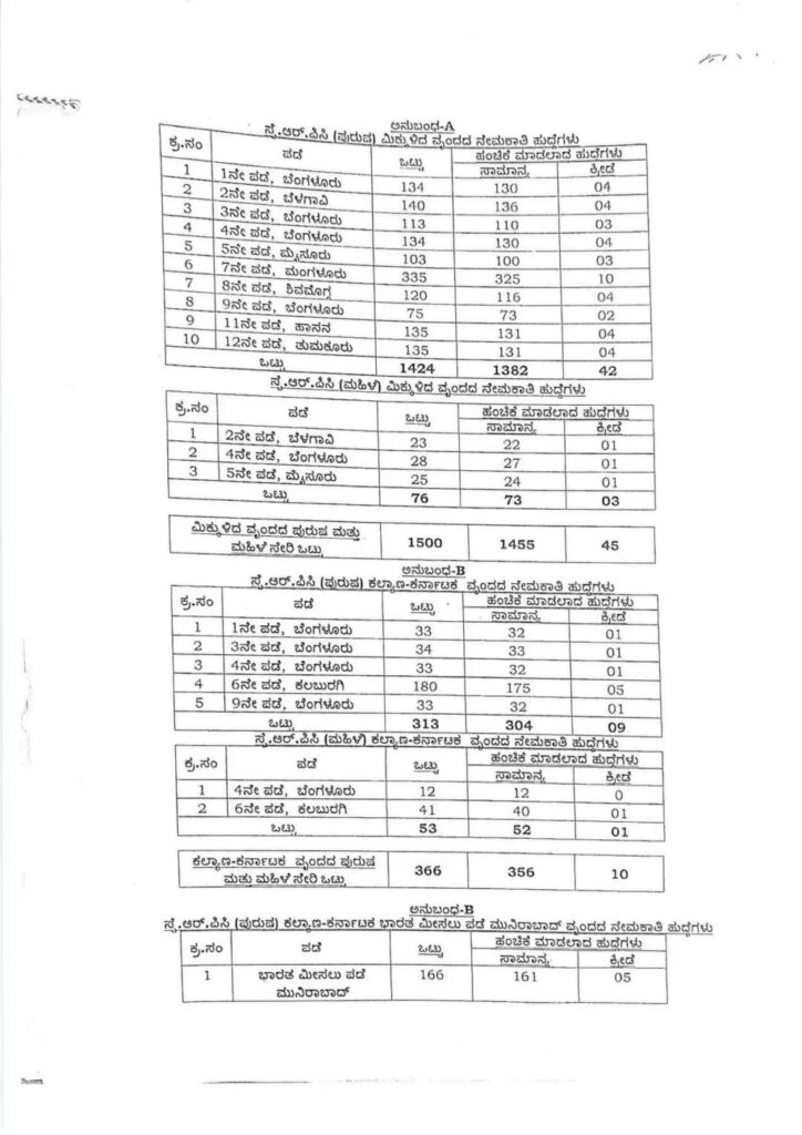 ಕೆ.ಎಸ್.ಆರ್.ಪಿ. ಸ್ಟೆ.ಆರ್ಪಿಸಿ (ಪುರುಷ) (ಮಹಿಳೆ) 1500 ಹುದ್ದೆಗಳನ್ನು ಹಾಗೂ (ಸ್ಥಳೀಯ ವೃಂದದ) 445 ಹುದ್ದೆಗಳನ್ನು ಮತ್ತು ಐ.ಆರ್.ಬಿ., ಮುನಿರಾಬಾದ್ ಘಟಕದ 220 ಹುದ್ದೆಗಳಿಗೆ ನೇರ ನೇಮಕಾತಿ ಮೂಲಕ ಭರ್ತಿ ಮಾಡಲು ಈಗಾಗಲೇ ತಮ್ಮ ಕಛೇರಿಯಿಂದ ಕಳುಹಿಸಲಾದ ನೇರ ಮತ್ತು ಸಮತಳ ವರ್ಗೀಕರಣ ವಿವರವನ್ನು ಪಕ್ಕಕ್ಕಿರಿಸಿದೆ.