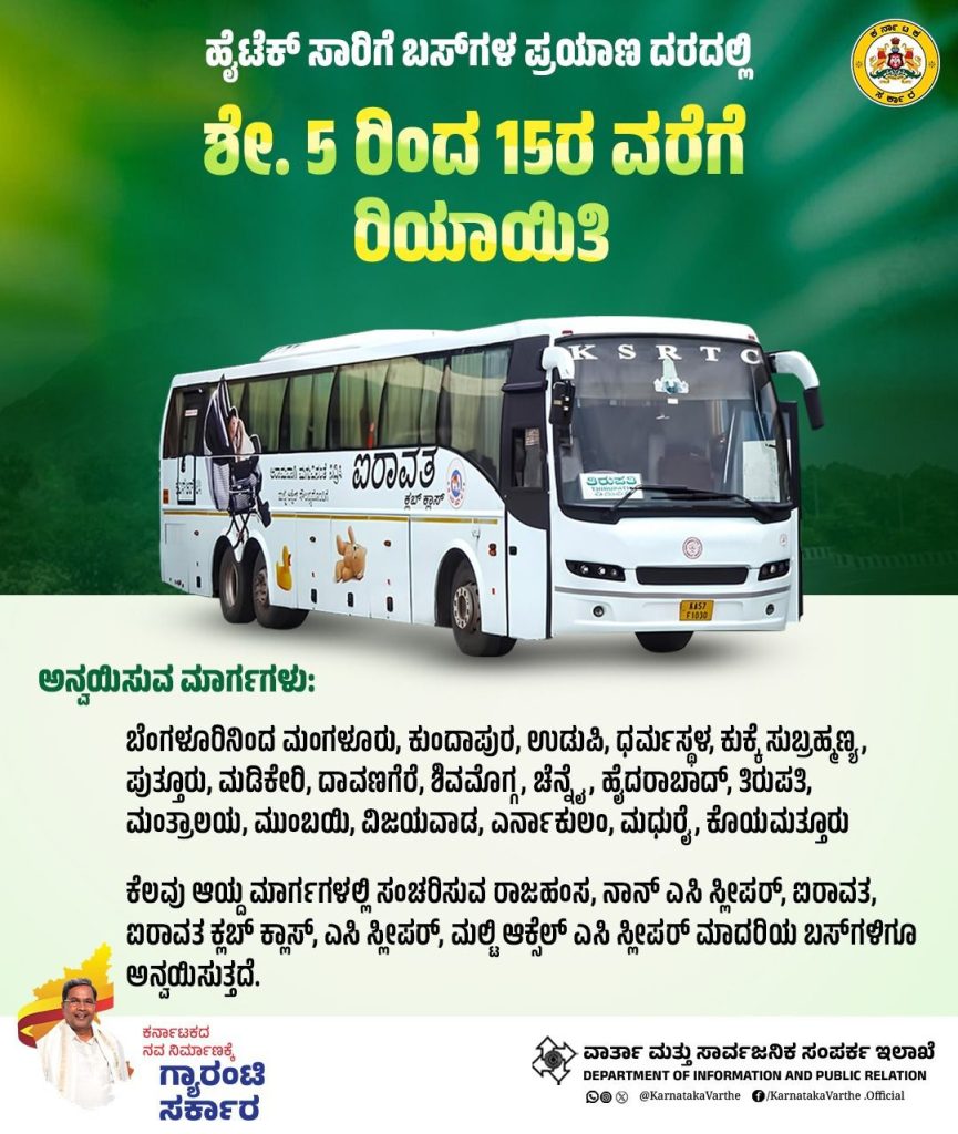KSRTC ಕೆಲವು ಮಾರ್ಗಗಳ ಬಸ್‌ ಪ್ರಯಾಣ ದರದಲ್ಲಿ ಶೇ.5 ರಿಂದ 15ರ ವರೆಗೆ ರಿಯಾಯಿತಿ